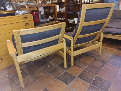 Sofagruppe udført i massiv lakeret eg m. hynder i uldstof. Produceret af Madsen & Schubell Møbelfabrik ca. 1970'erne. Fremstår i pæn brugt stand.