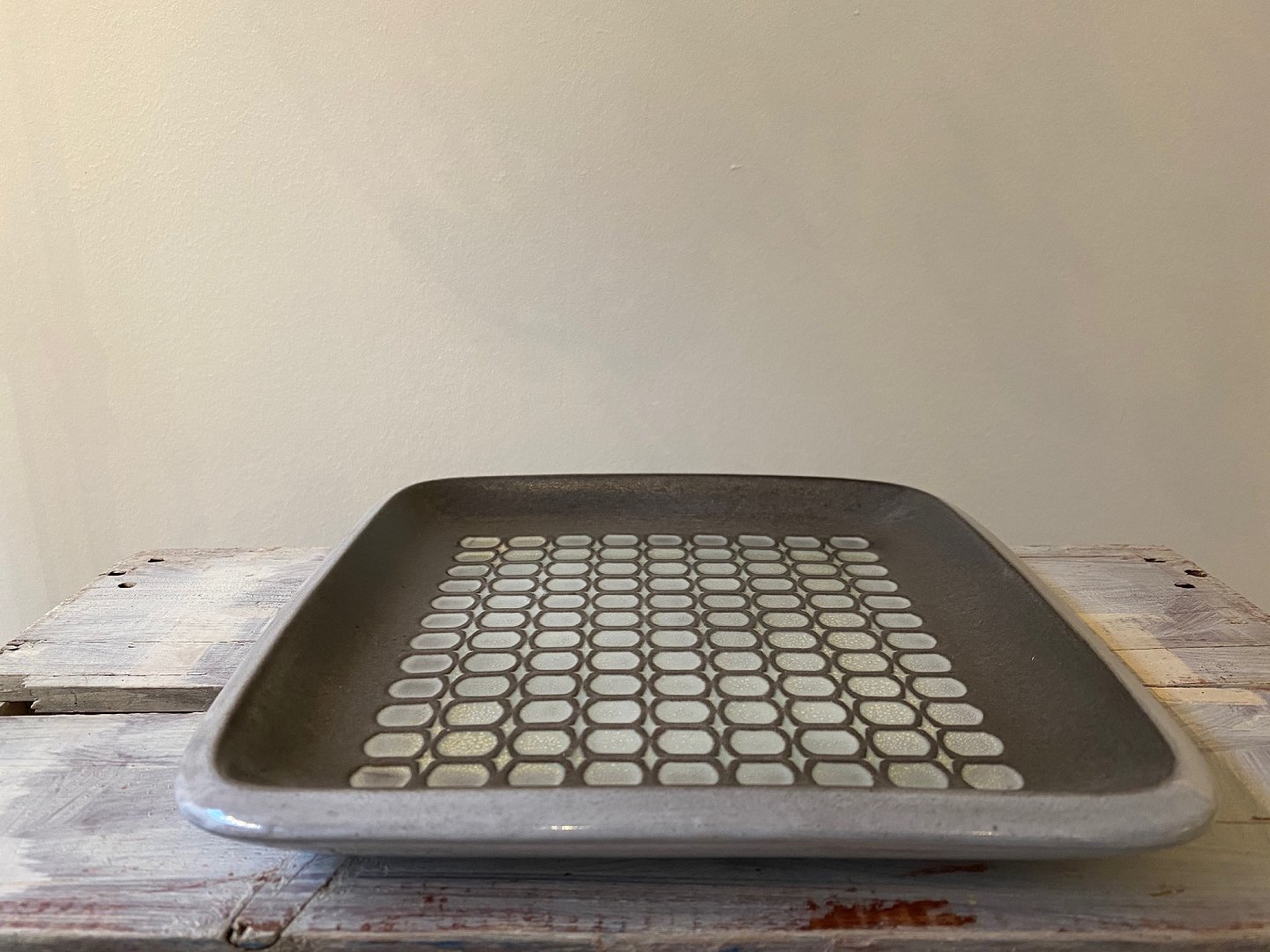 Flot firkantet skål af den svenske keramiker Mari Simmulson for Upsala-Ekeby i 1960erne. Skålen / fadet er glaseret i brunt med hvide felter og hvid kant. Skålen er signeret UE for Upsala-Ekeby og "ms" for Mari Simmulson.