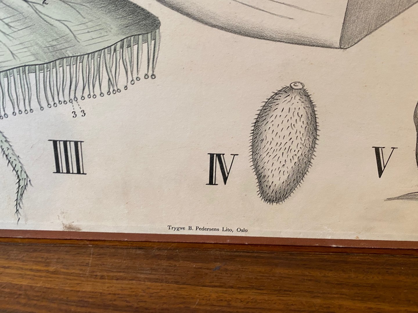 Skoleplanche / zoologisk planche med sødyr, herunnder gopler. Måler ca. 60 x 76 centimeter med ophæng i form af snor. God vintage stand med patina - se fotos. Cirka 1950'erne. Kan desværre ikke sendes, men skal afhentes i butikken på Vesterbrogade 177, 1800 Frederiksberg C.