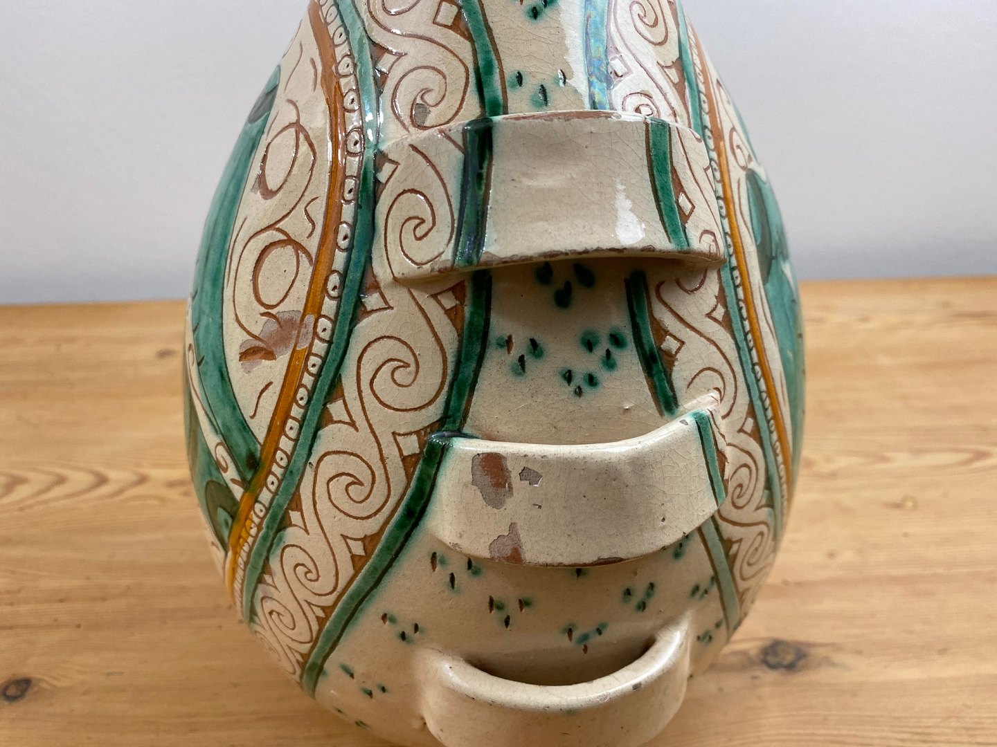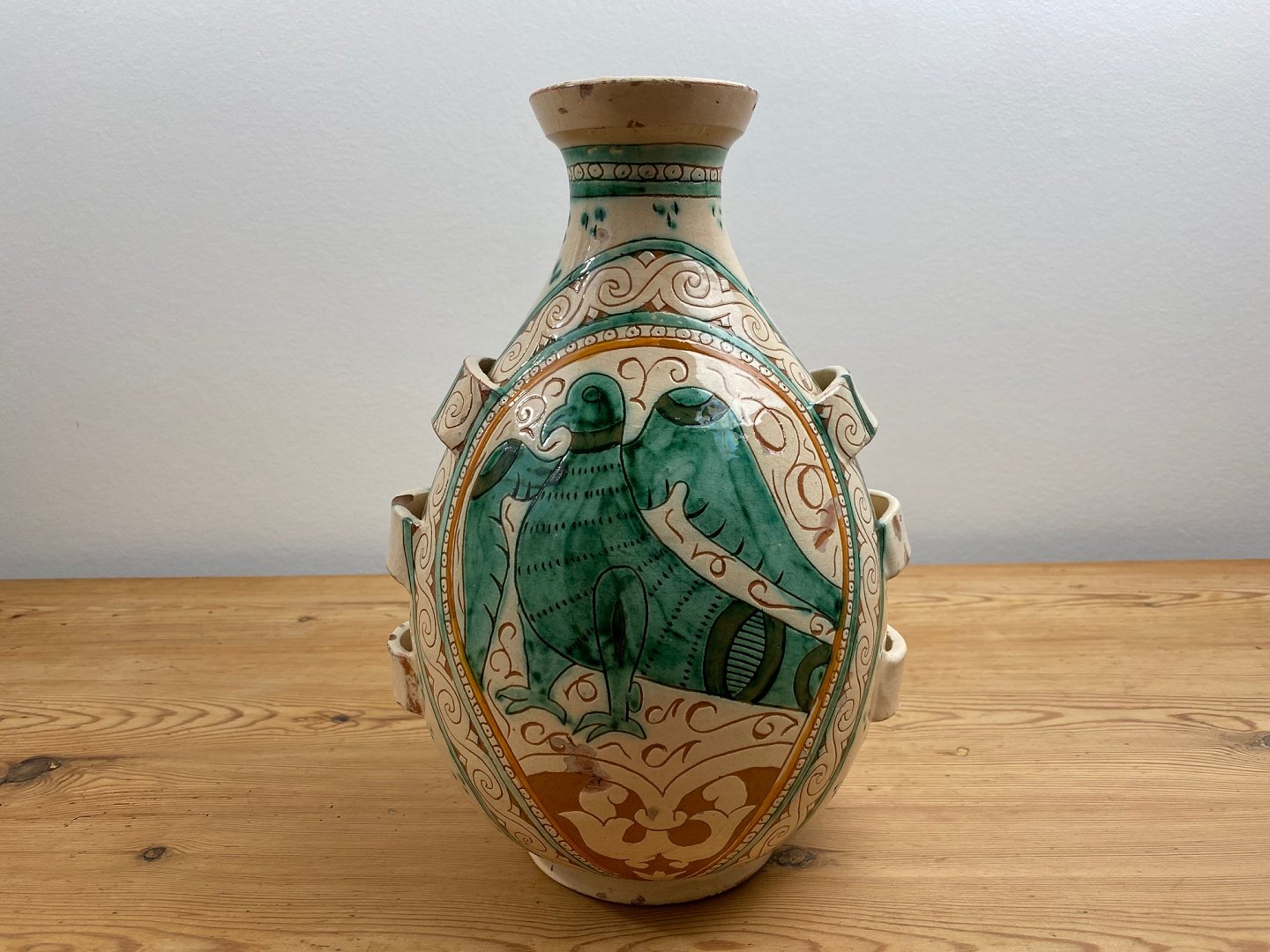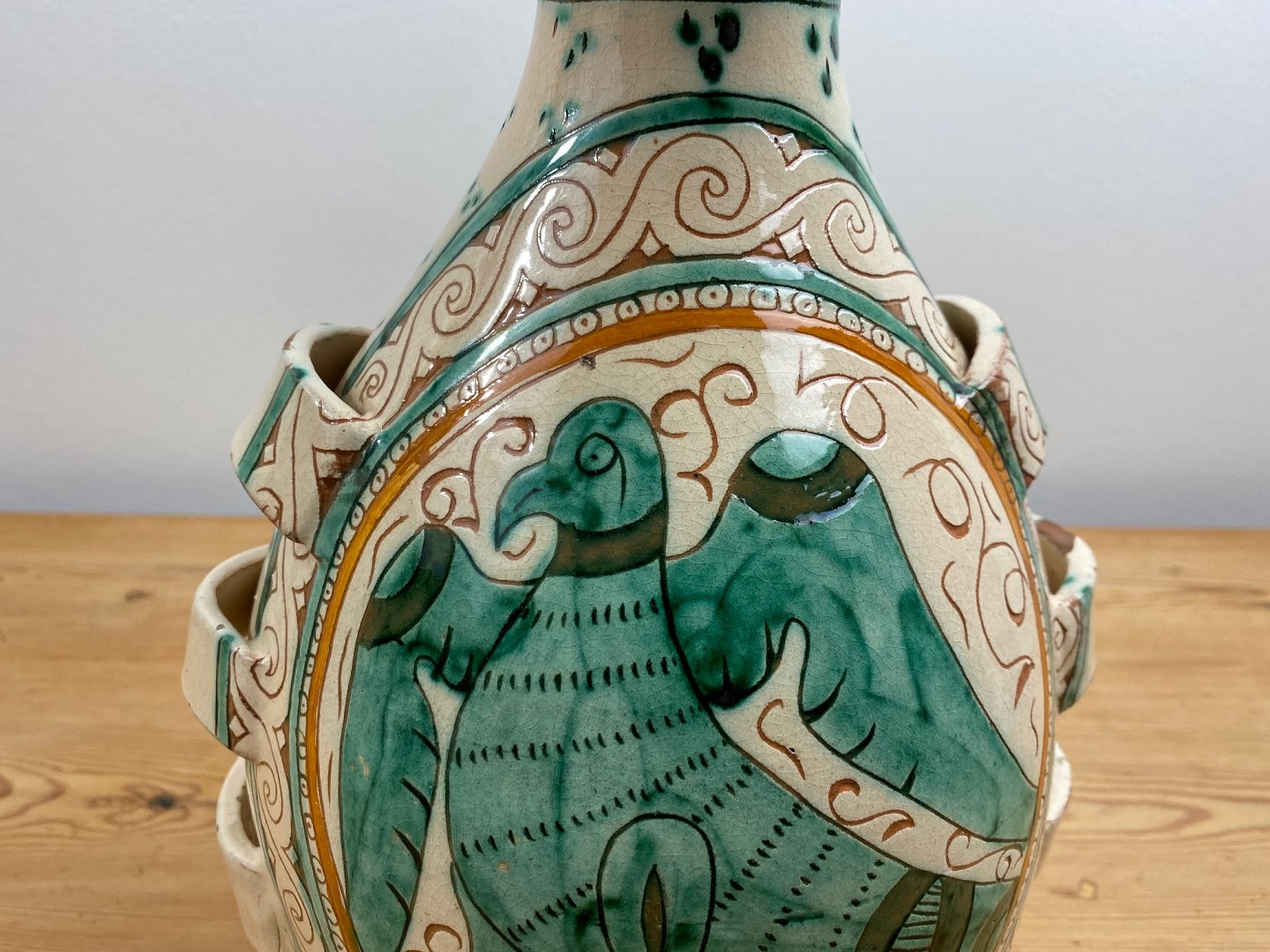 Motivet på vasen er en stor grøn fugl / ørn. Vasen er i fair stand med en hel del glasurbortfald og afslag (se fotos).