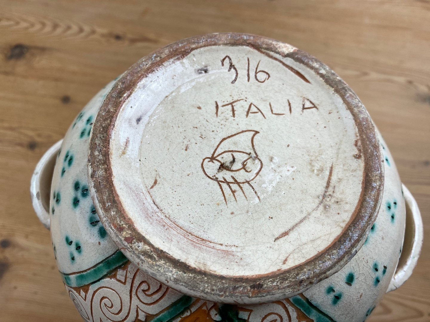 Vasen er signeret med en båd med sejl og årer, hvilket er signaturen for San Zeno i Pisa, som var et italiensk keramikværksted, der i 1920'erne blev etableret af Laura Rauschi. Værkstedets mål var at træne unge kvinder i at lave keramik efter modeller fra 1300-tallet og 1400-tallet. Værkstedet lukkede i 1940.