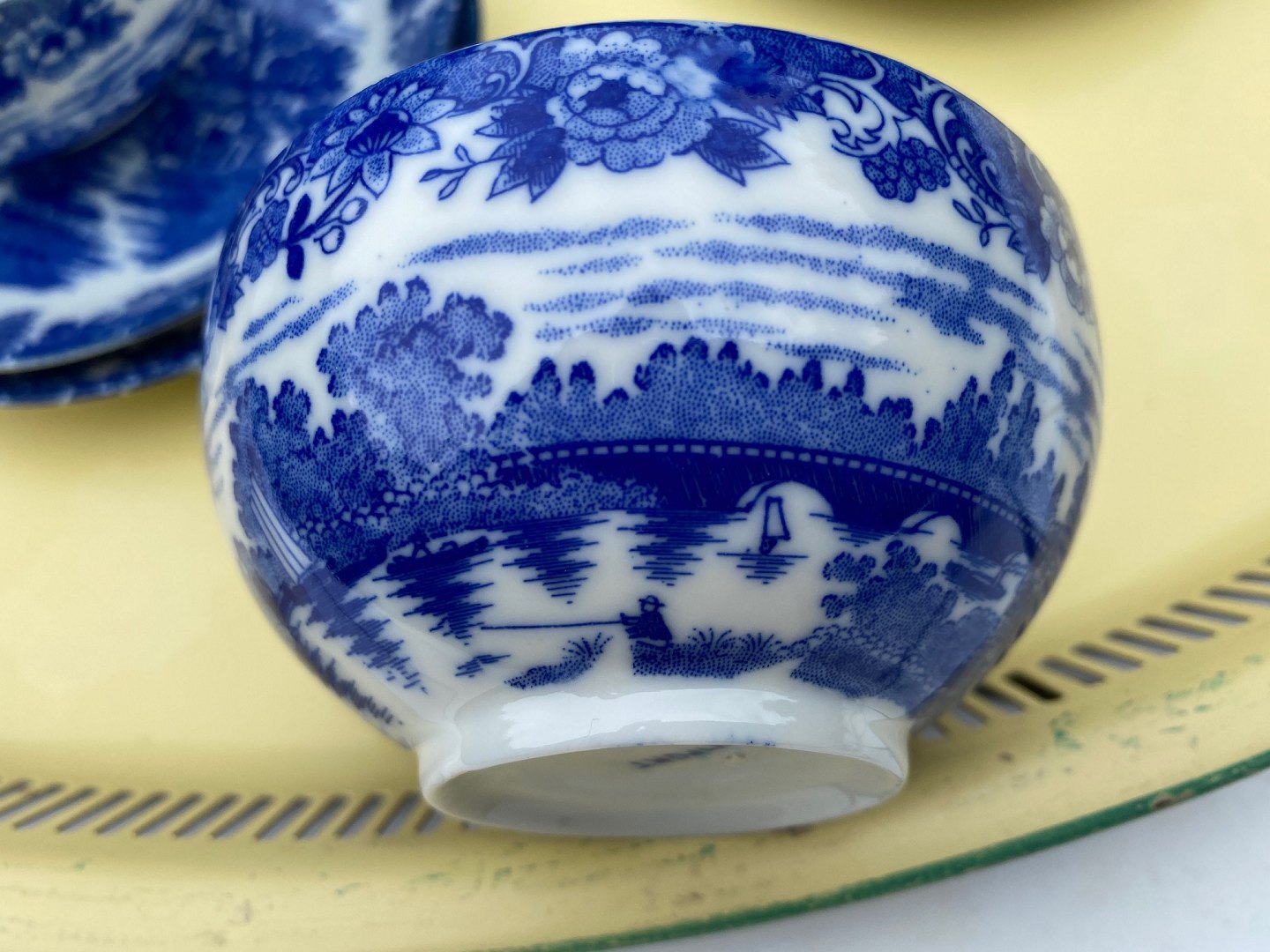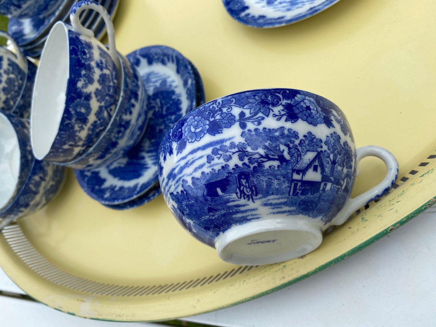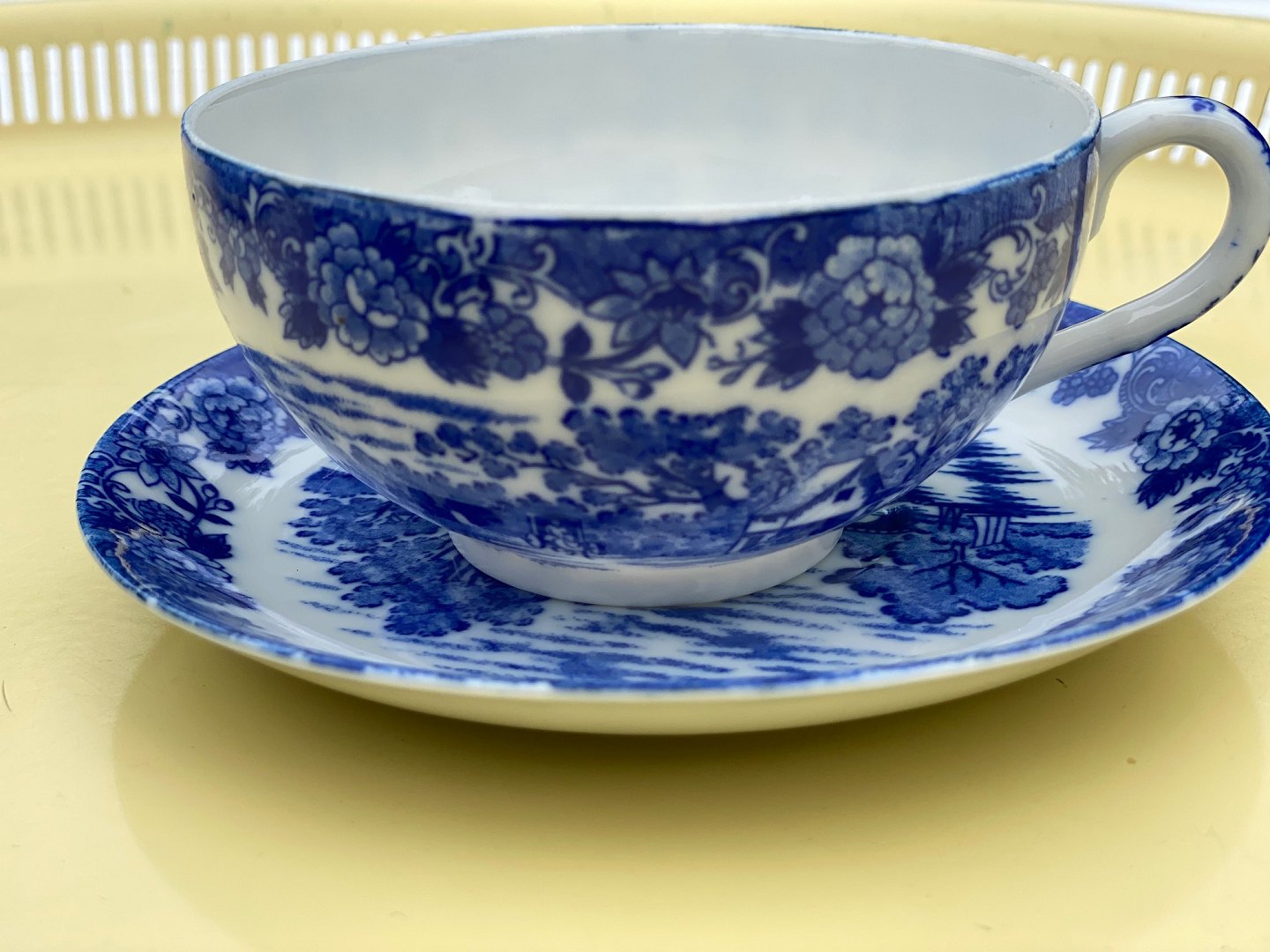 Smukke vintage tekopper og underkopper med blå-hvidt transfer-mønster af huse, hav med både og menesker, der fisker, vogne, en bro, træer og blomster.