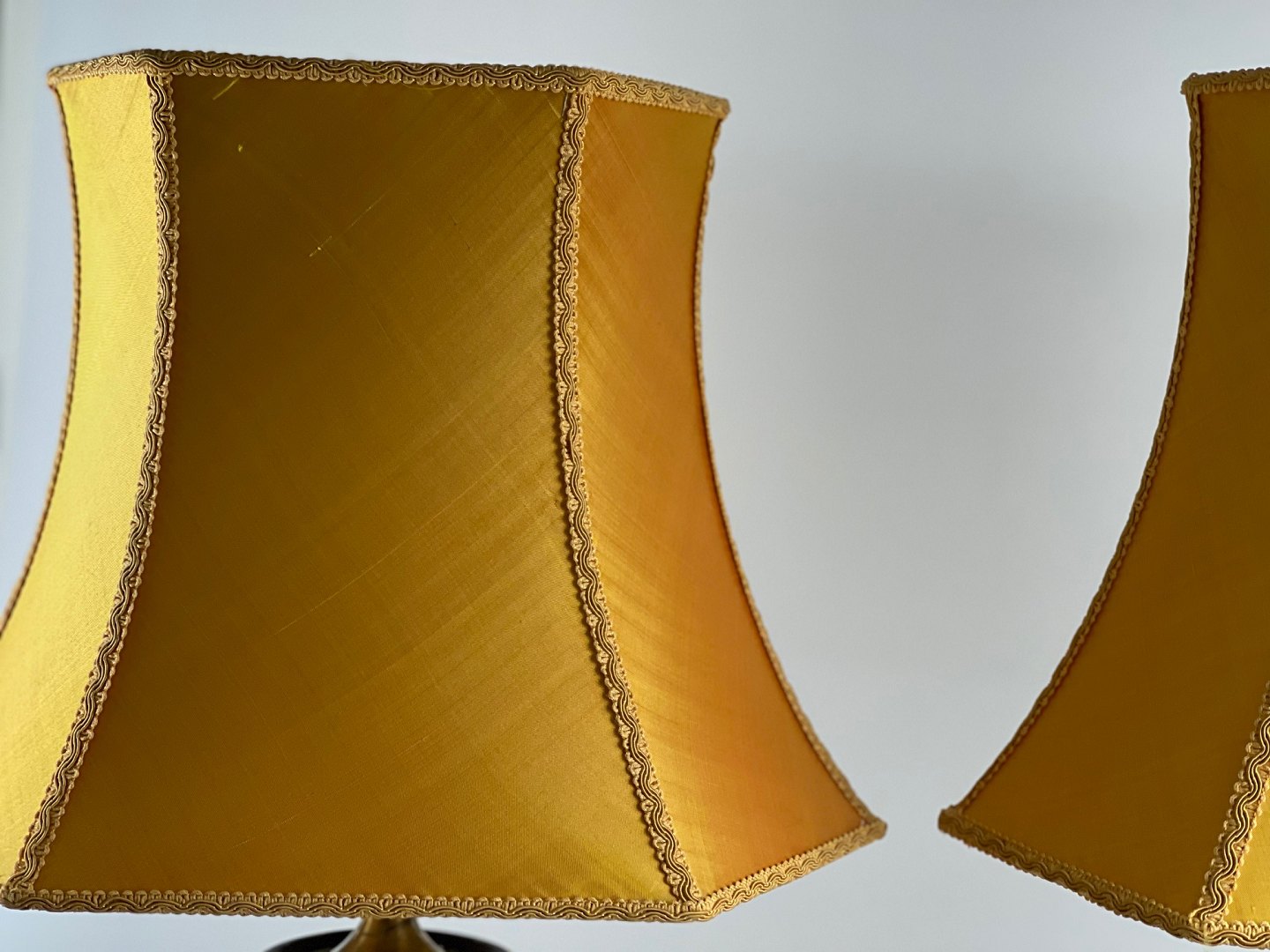 Par lamper fra midten af det 20. århundrede. Lamperne er lavet af drejet, sortlakeret træ med guldbemaling. Motiver af dansende gudinder. Smukke gule skærme af thaisilke med patina (se foto af plet på toppen af den ene skærm).