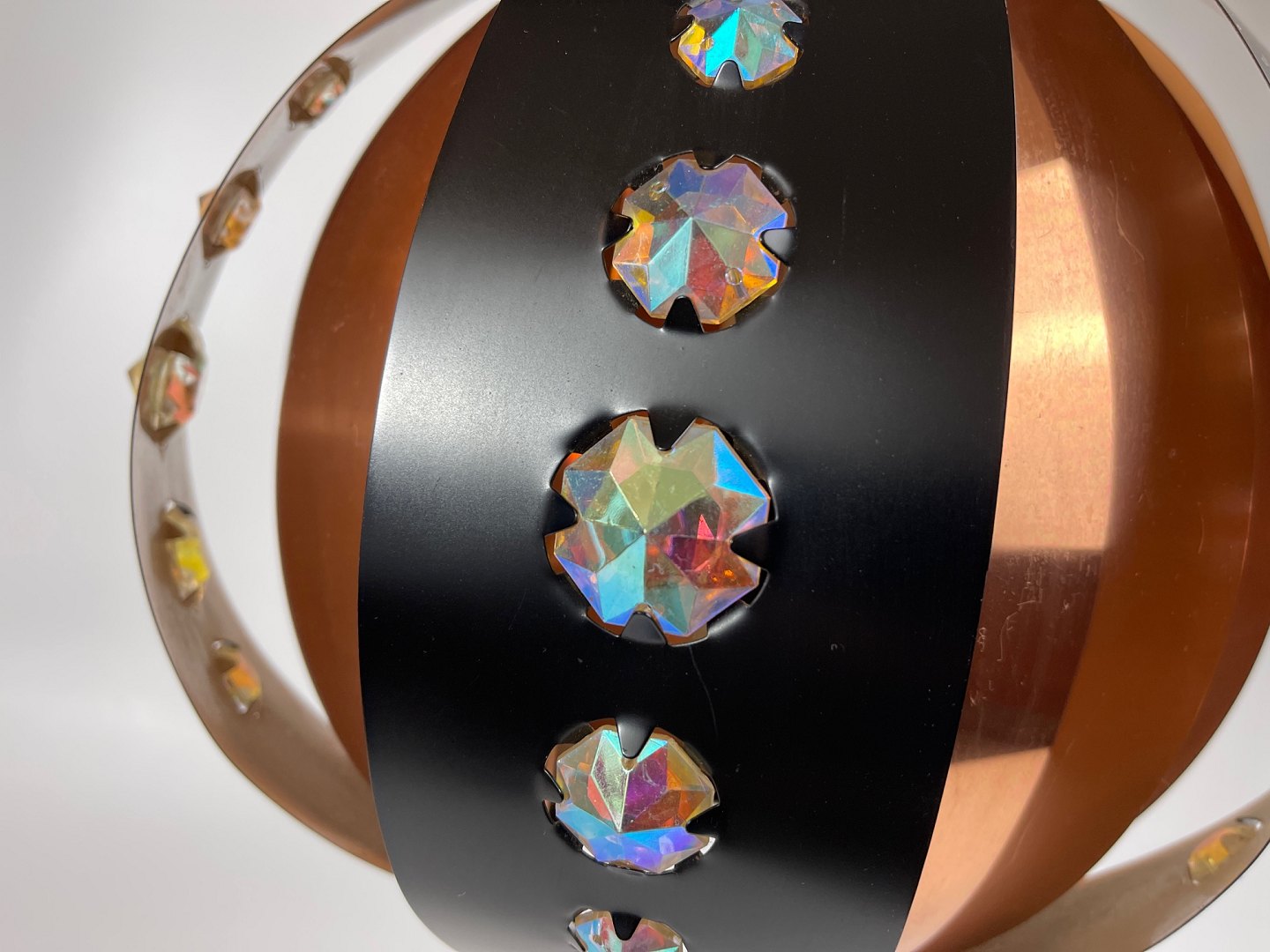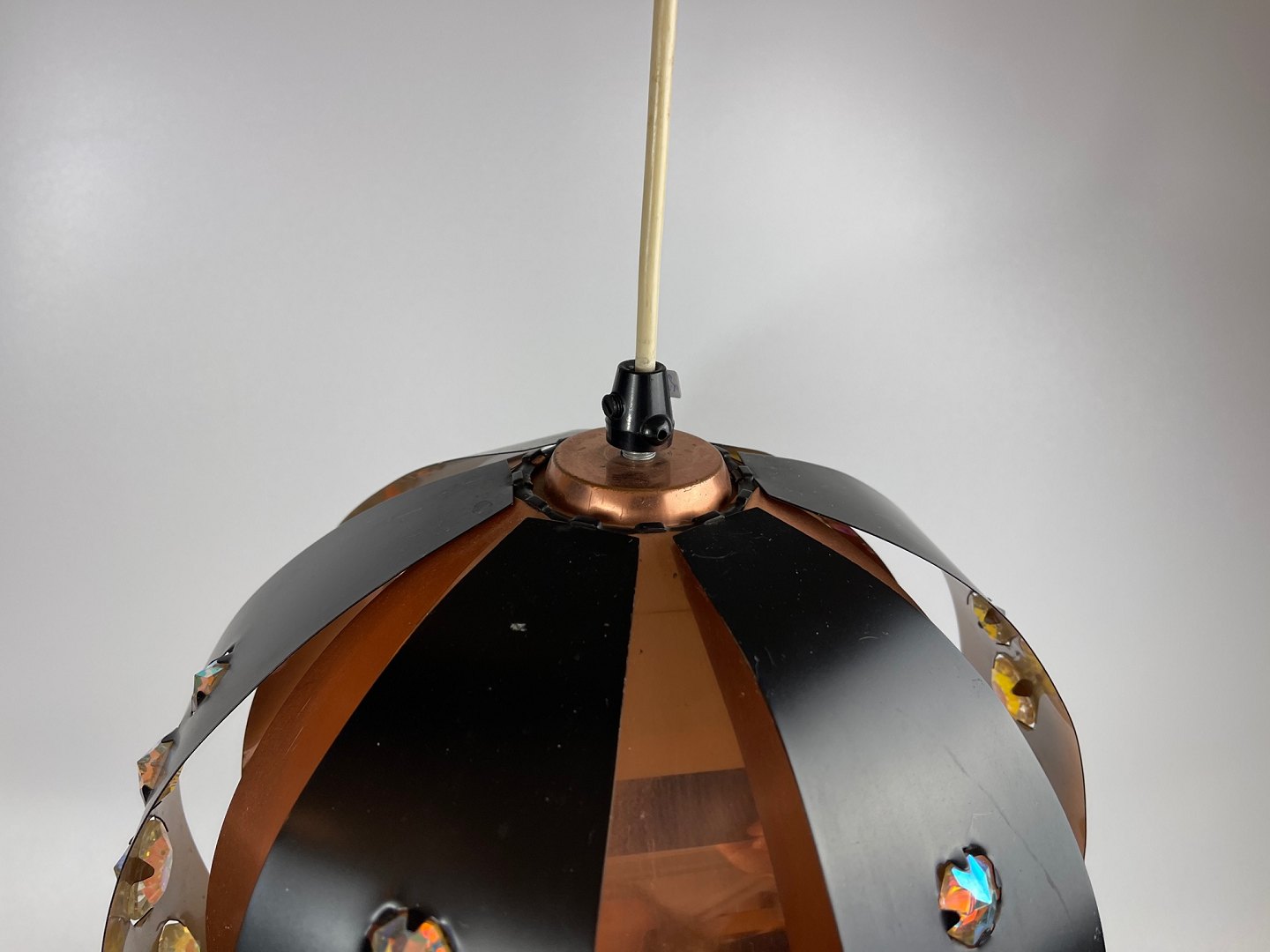 Lampe af den danske designer Werner Schou for Coronell, Mid Century Space Age, 1960'erne, i sort metal, kobber og prismer. Fin vintage stand med almindelige brugsspor.