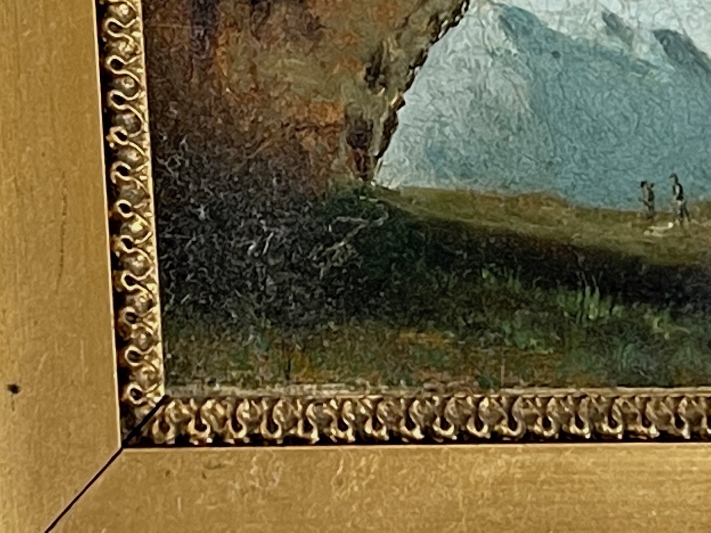 Maleri af landskab med bro, borg-ruin og mennesker - muligvis tysk eller østrisk - betegnet på bagsiden med blyant Hans Fischer, utydeligt signeret med initialer i nederste venstre hjørne.