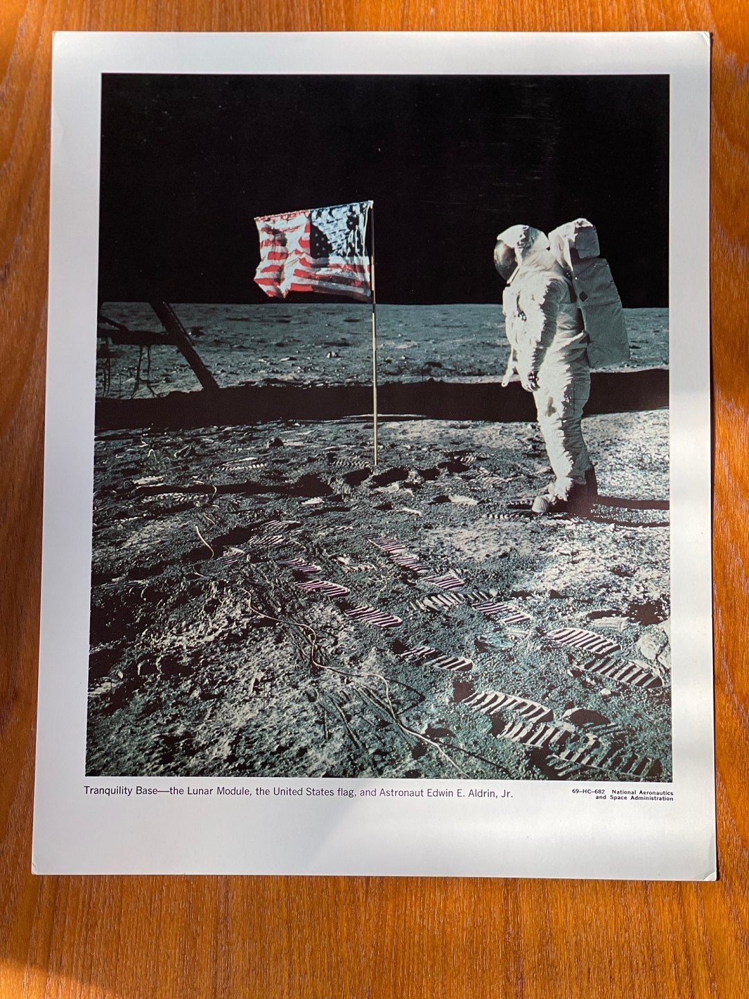 Originalt NASA farveoffsetfotografi / fotoprint fra 1969 af Edwin "Buzz" Aldrin under Apollo-11 månemissionen, der satte de første mennesker på Månen. Aldrin ses ved det amerikanske flag "Old Glory".