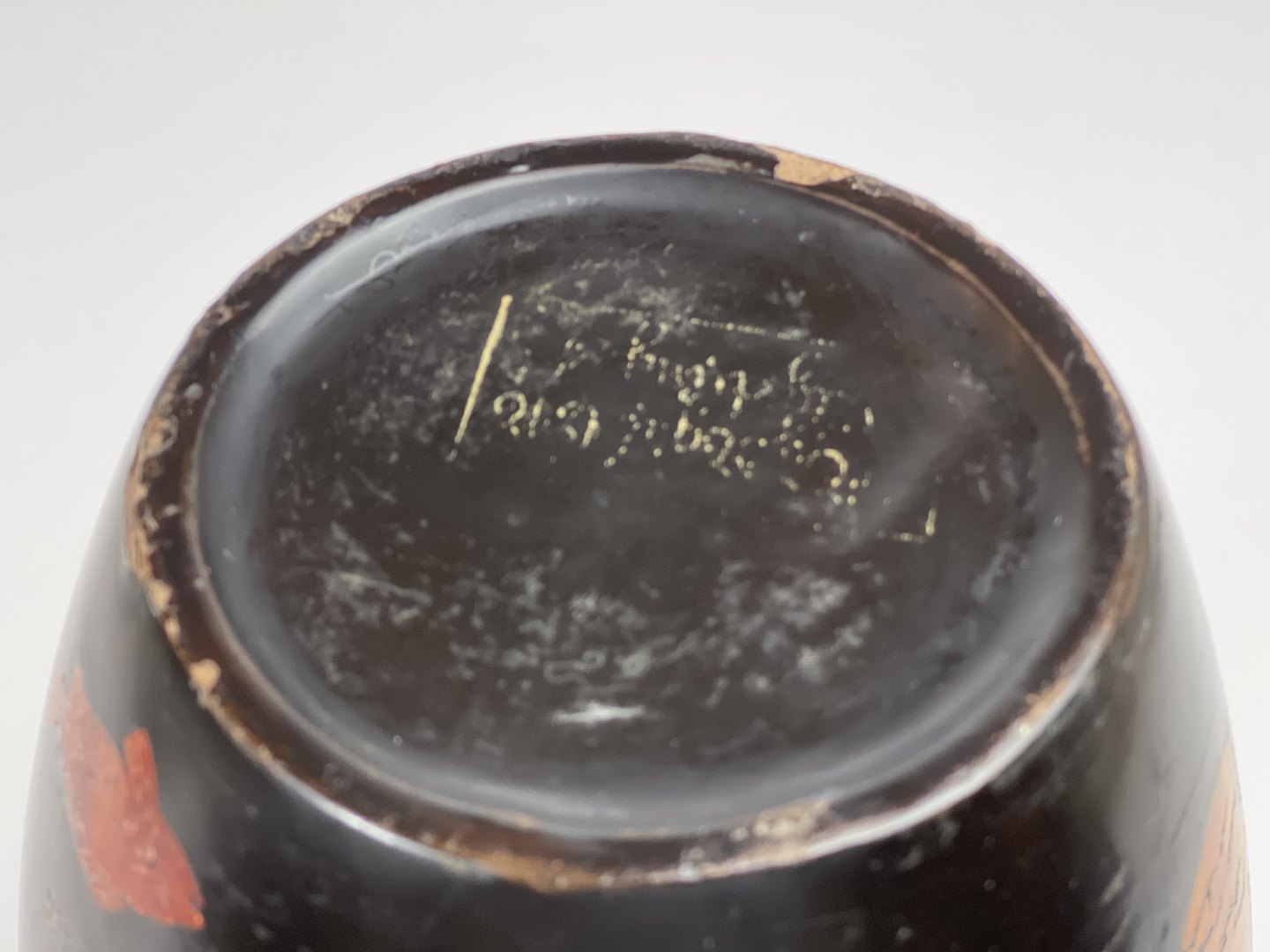 Vintage asiatisk lakvase med motiv af koifisk eller guldfisk samt solopgang eller solnedgang over havet. Japansk eller måske vietnamesisk.