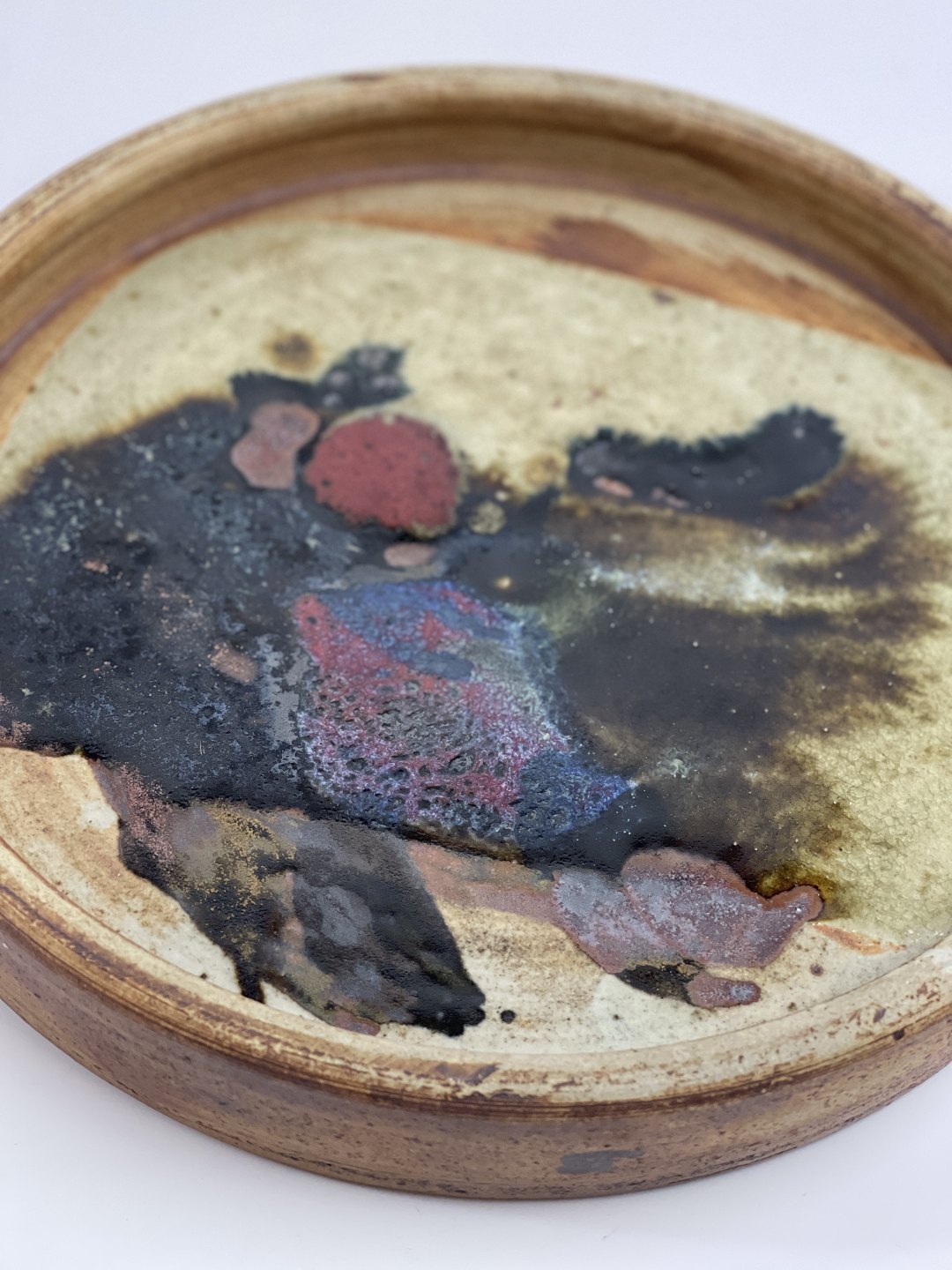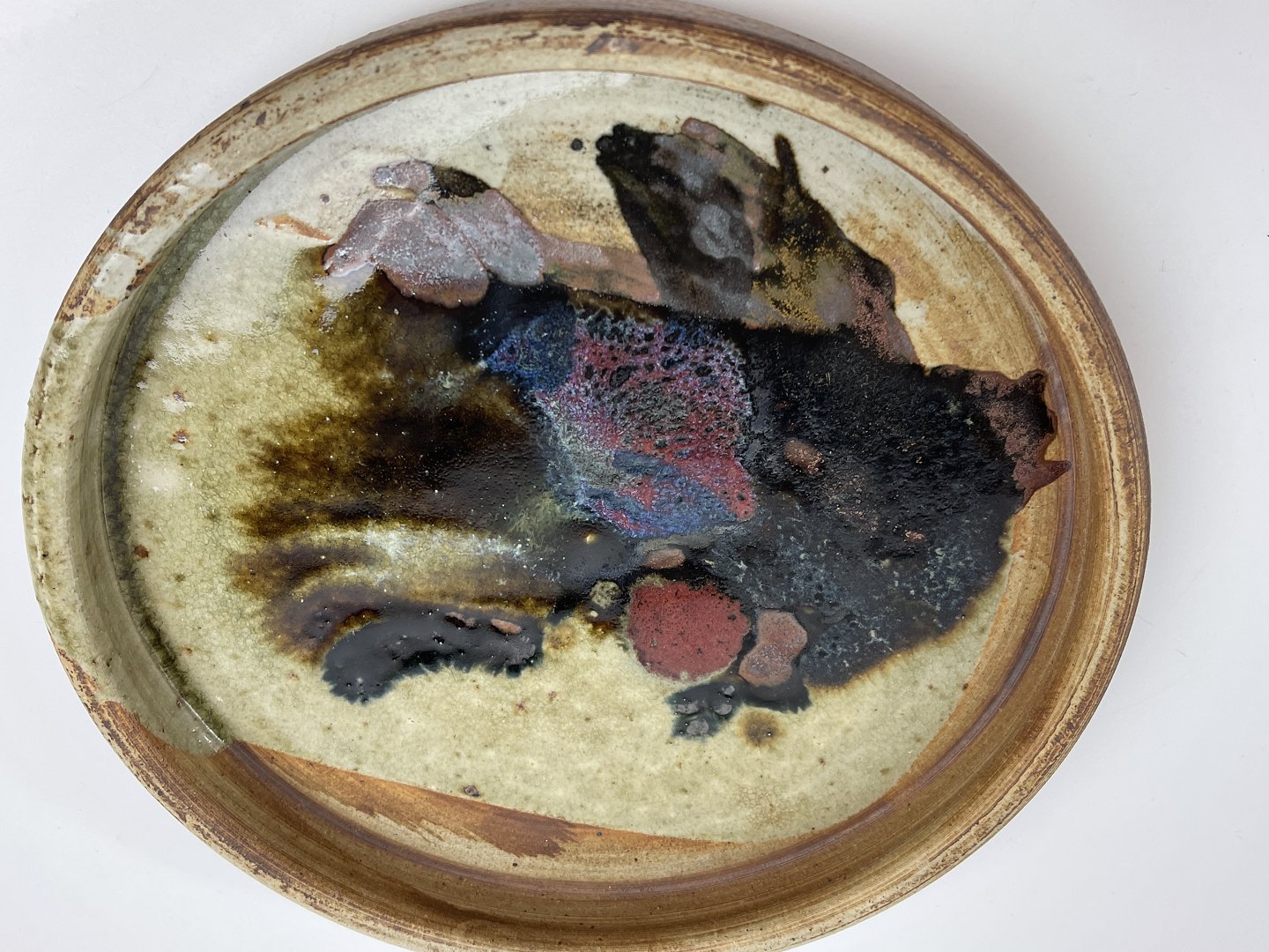 Conni Walther, own workshop. Large dish with multicolored glaze. 20th Century.