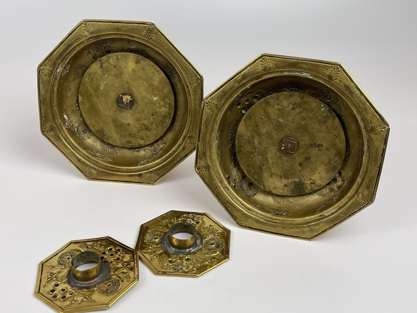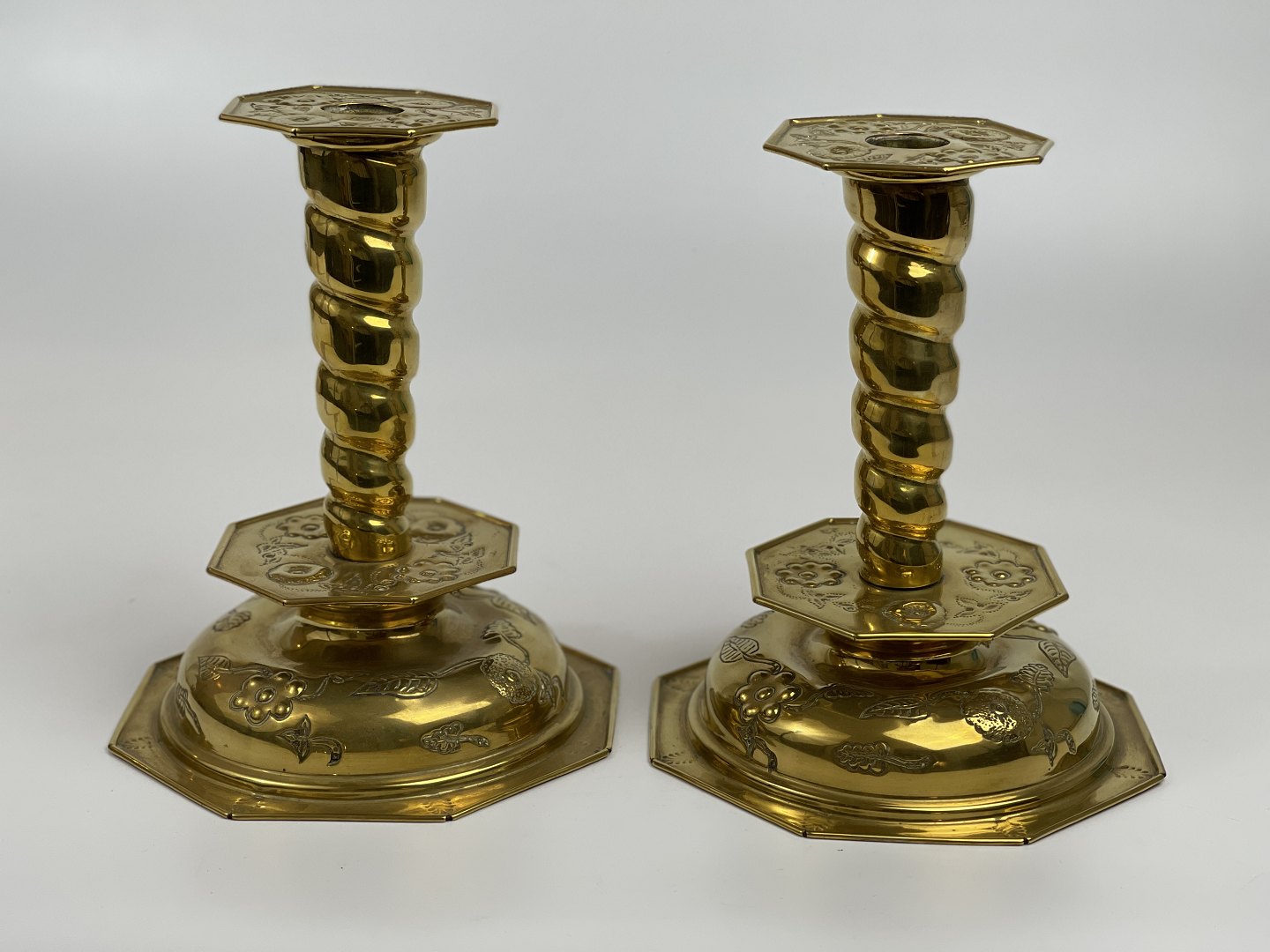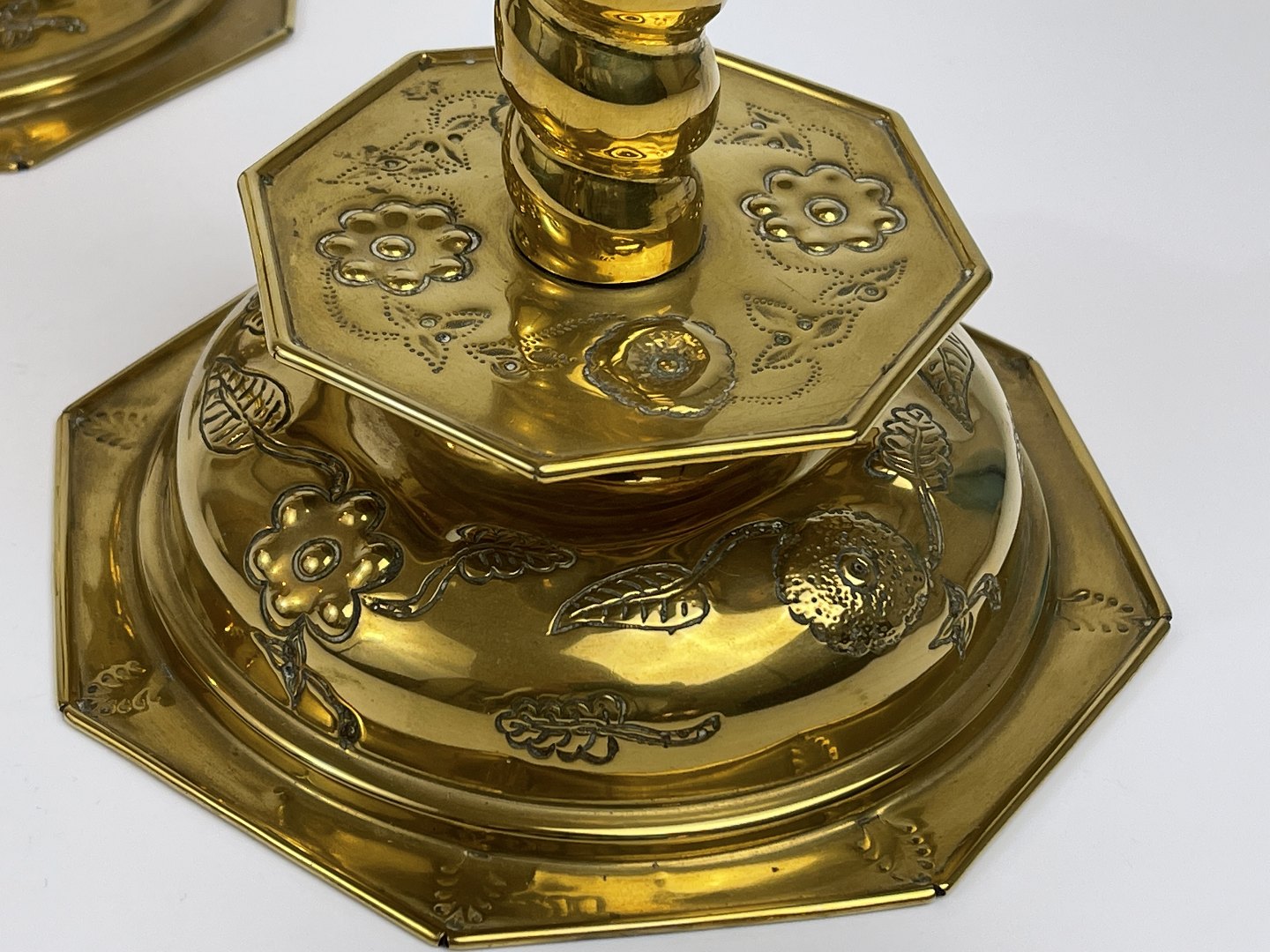 Par superflotte lysestager i udstancet (repousse-teknik) messing (messing-blik). Barok-form, 20. århundrede. Flot kvalitet. Blomster- og bladranker.
