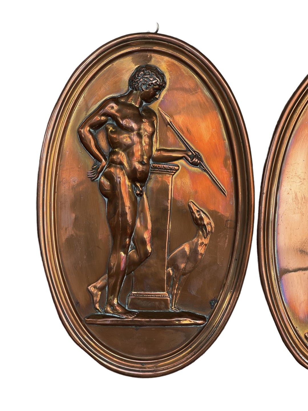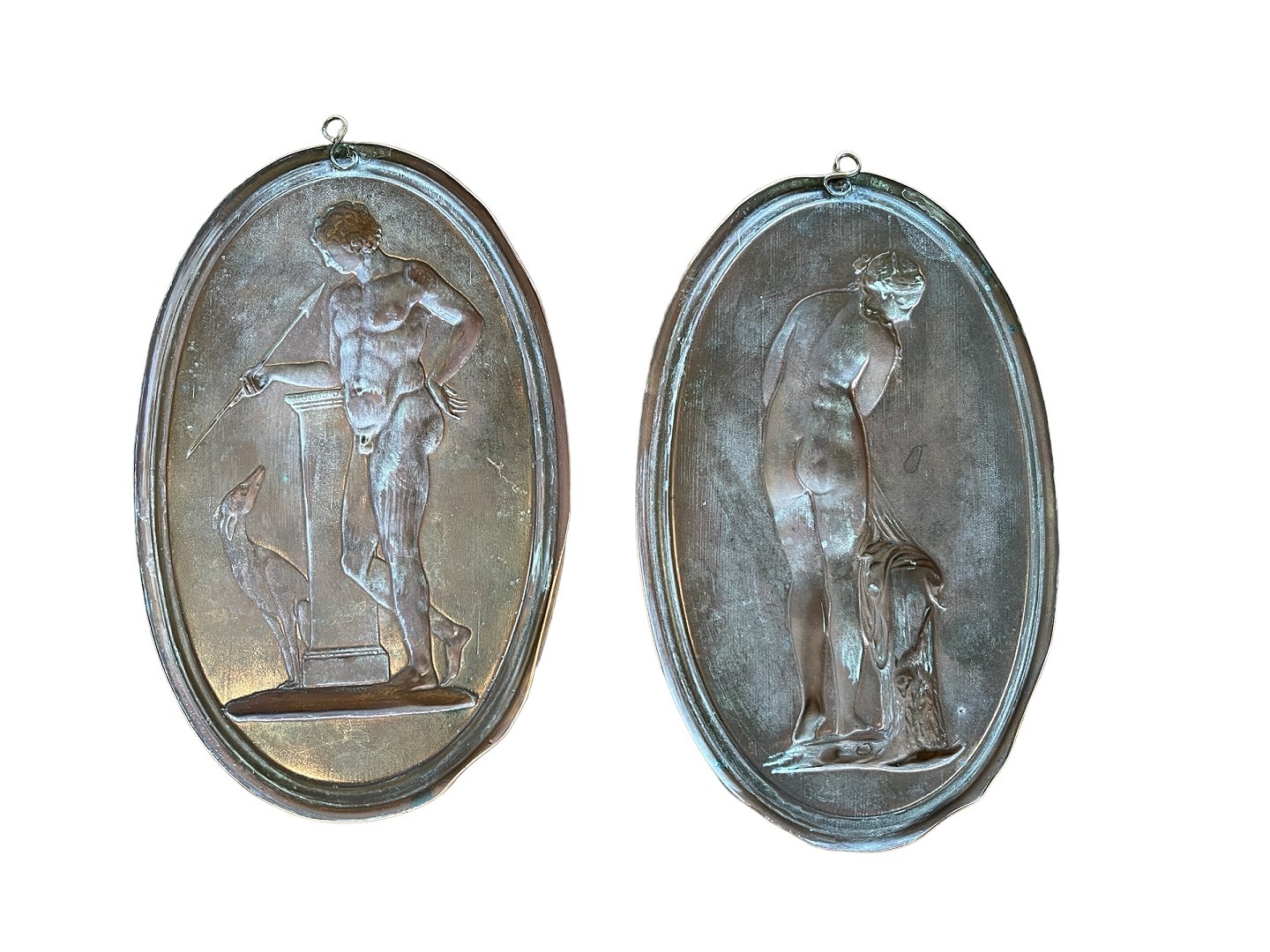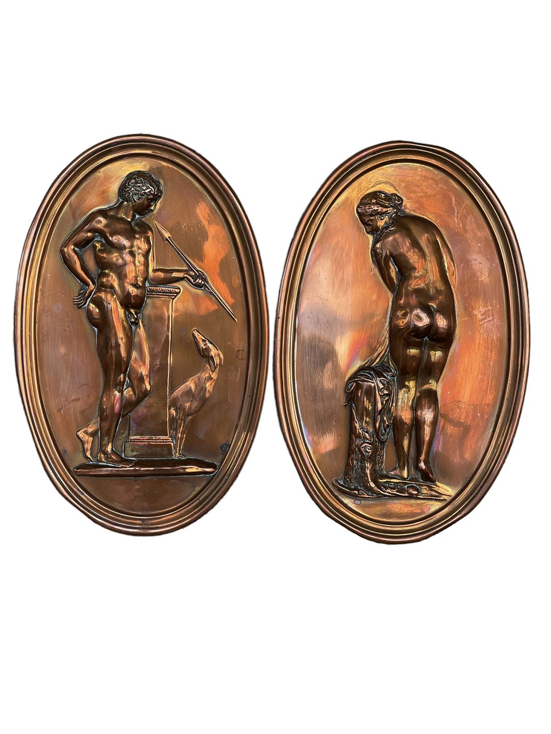 To ovale kobberophæng med klassiske motiver af kvinde (formentlig Venus) samt mand med hund (Mars).