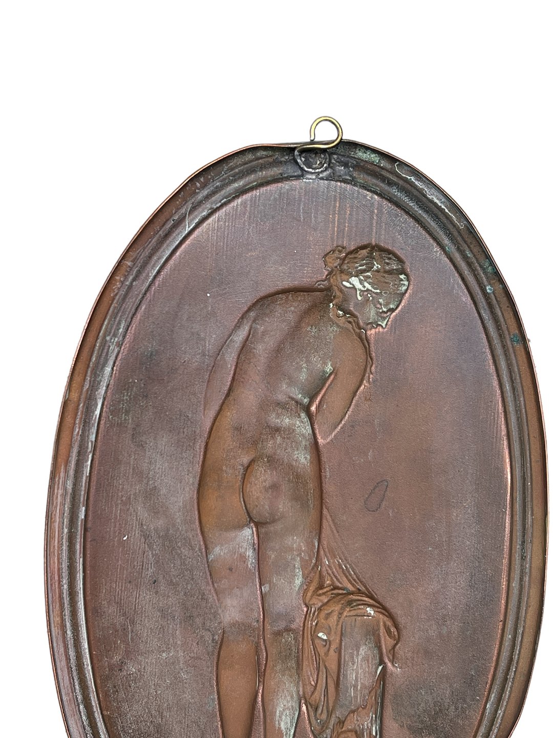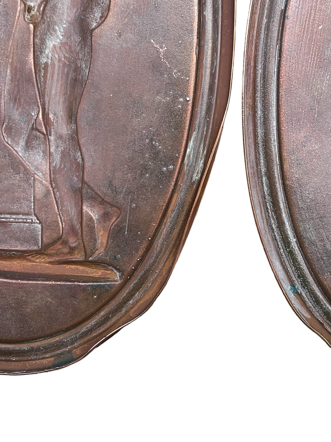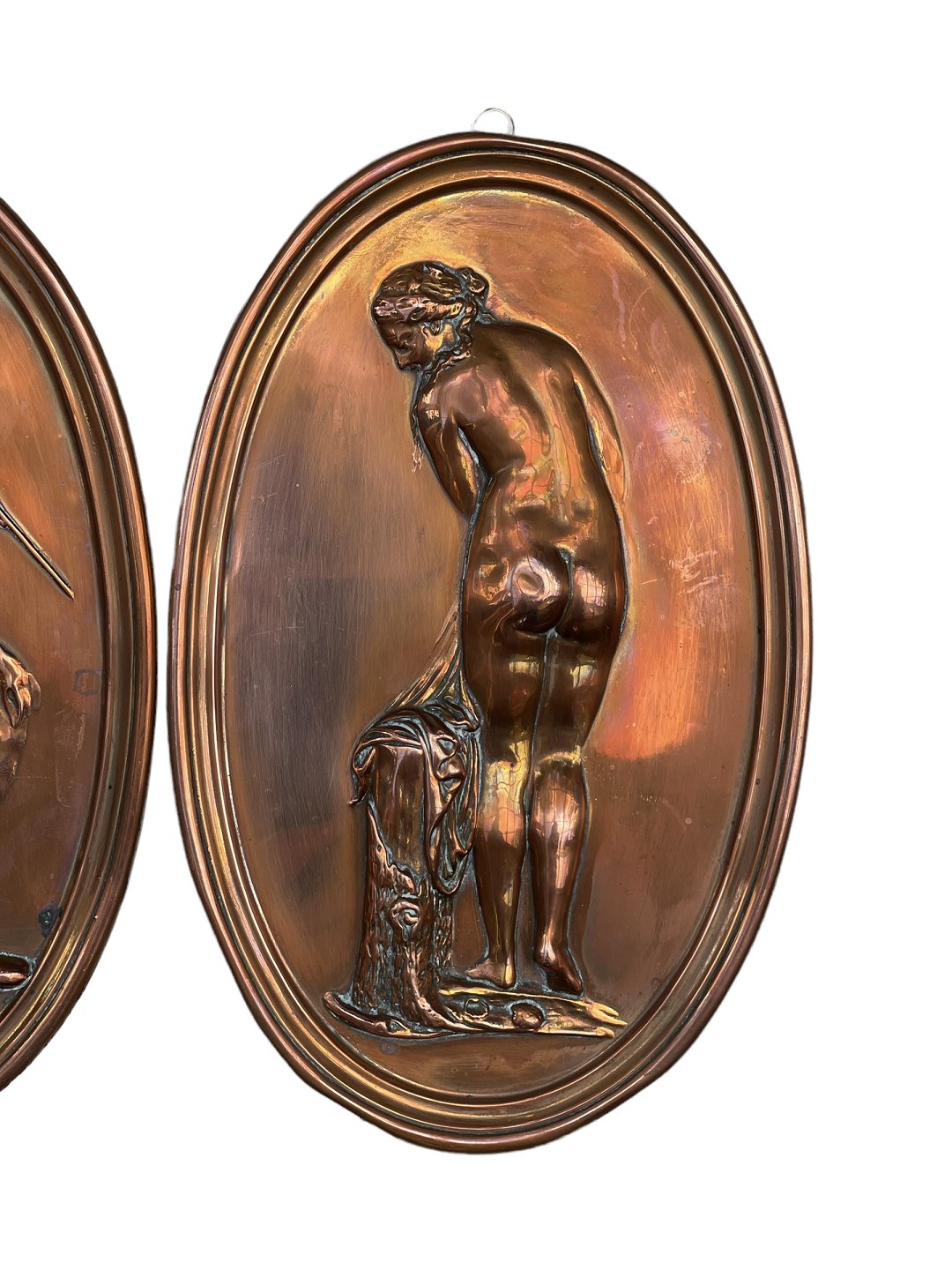 To ovale kobberophæng med klassiske motiver af kvinde (formentlig Venus) samt mand med hund (Mars).