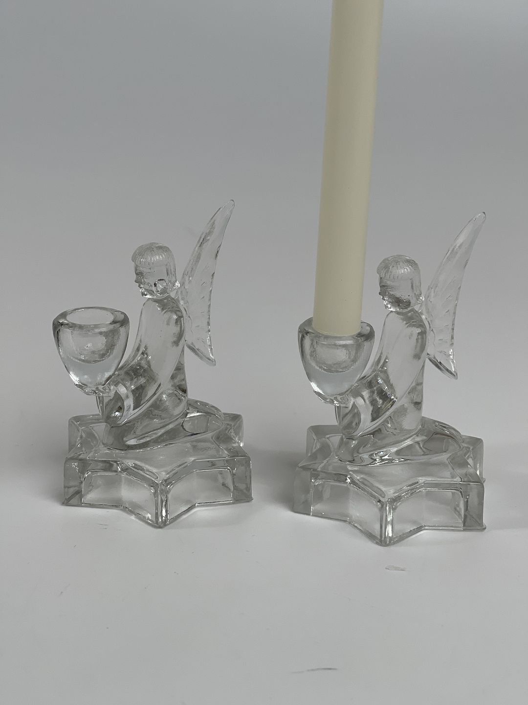 Par art deco engle-lysestager i klart presset glas. L. E. Smith Glass Co.