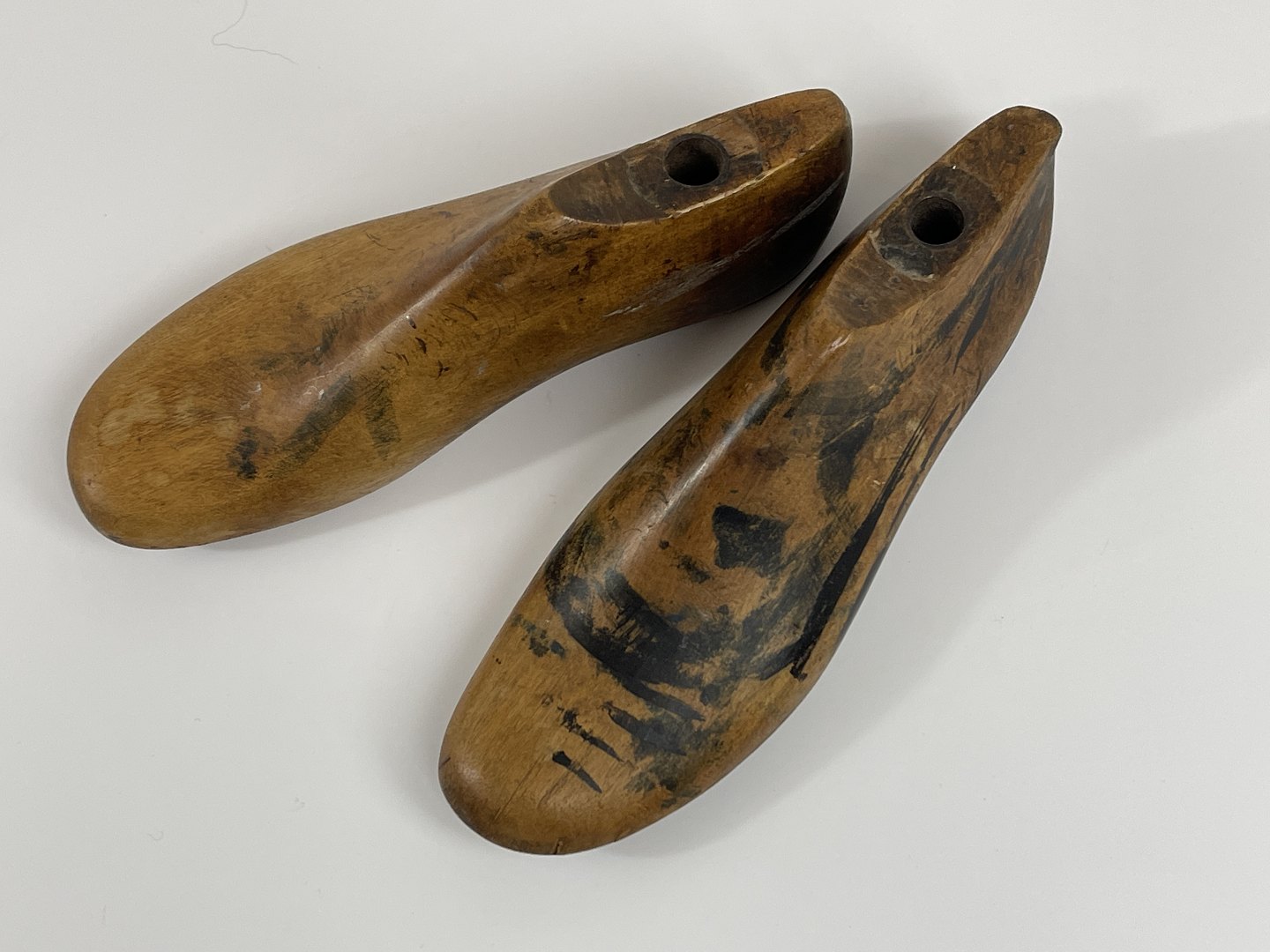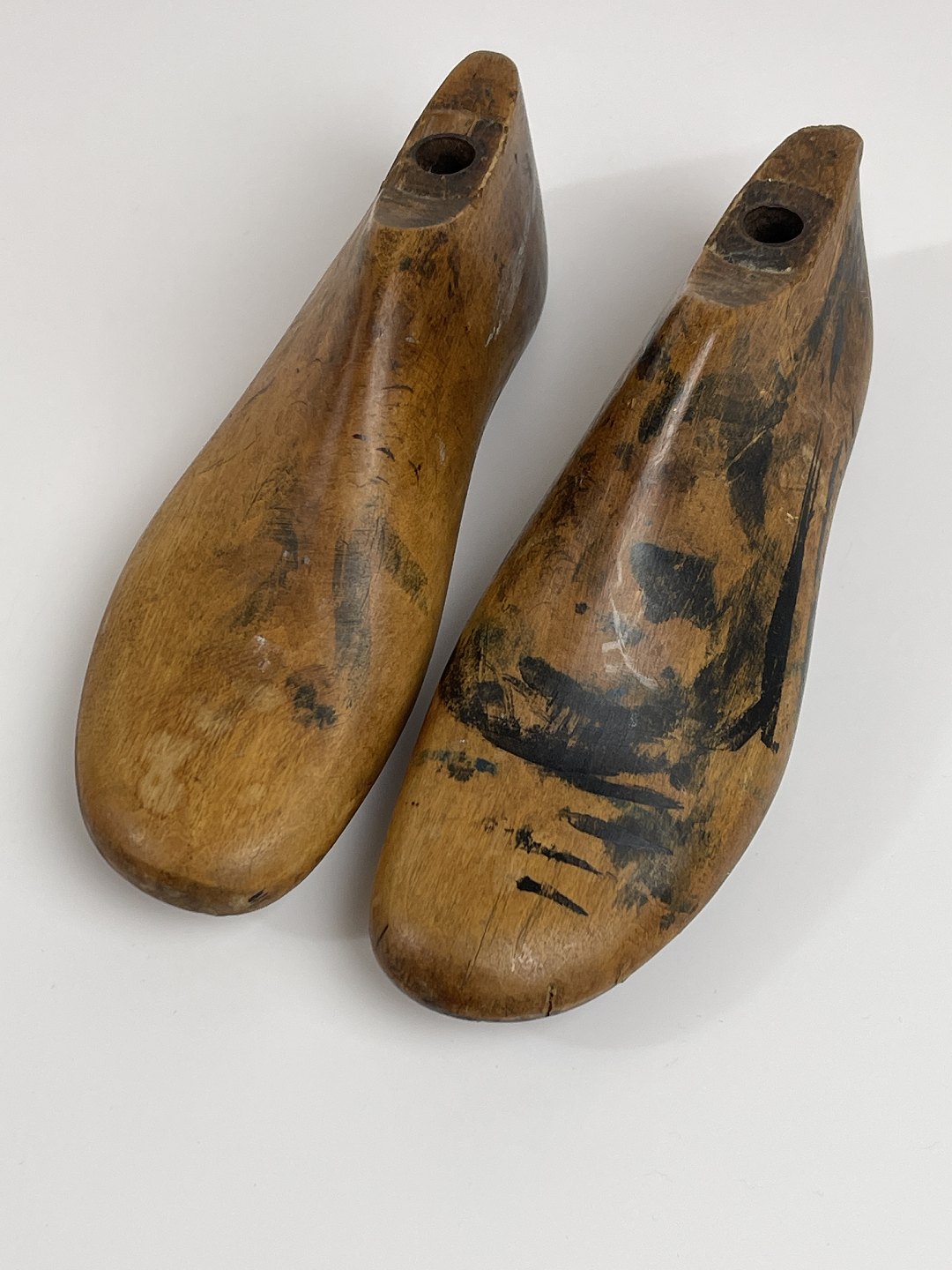 Par antikke træ-skolæster i størrelse 36. Mærker efter skomagerens arbejde med huller efter nåle/søm i sålen.