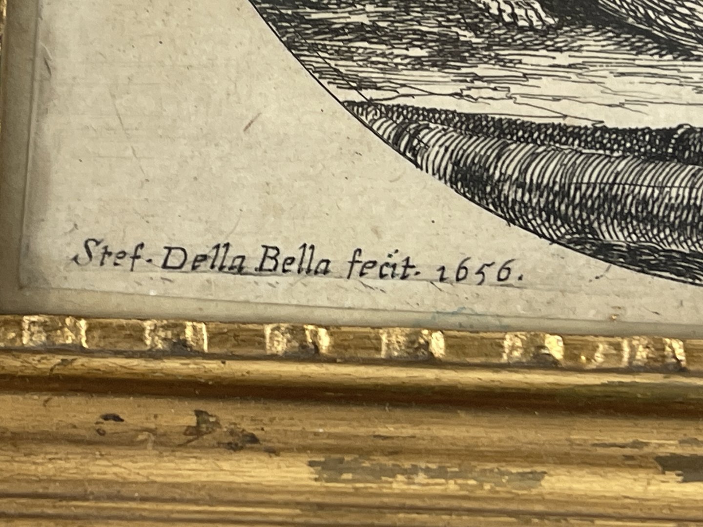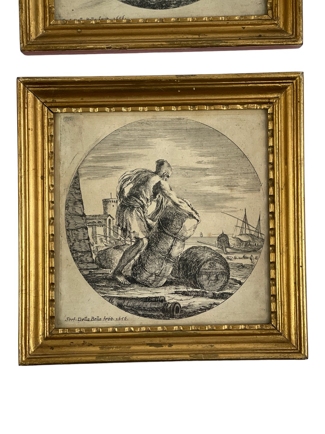Par raderinger af Stefano Della Bella, 17. århundrede. Senere guldrammer med røde kanter. Skibsmotiver / havnemotiver. Signeret i trykket Stef. Della Bella og dateret 1656.