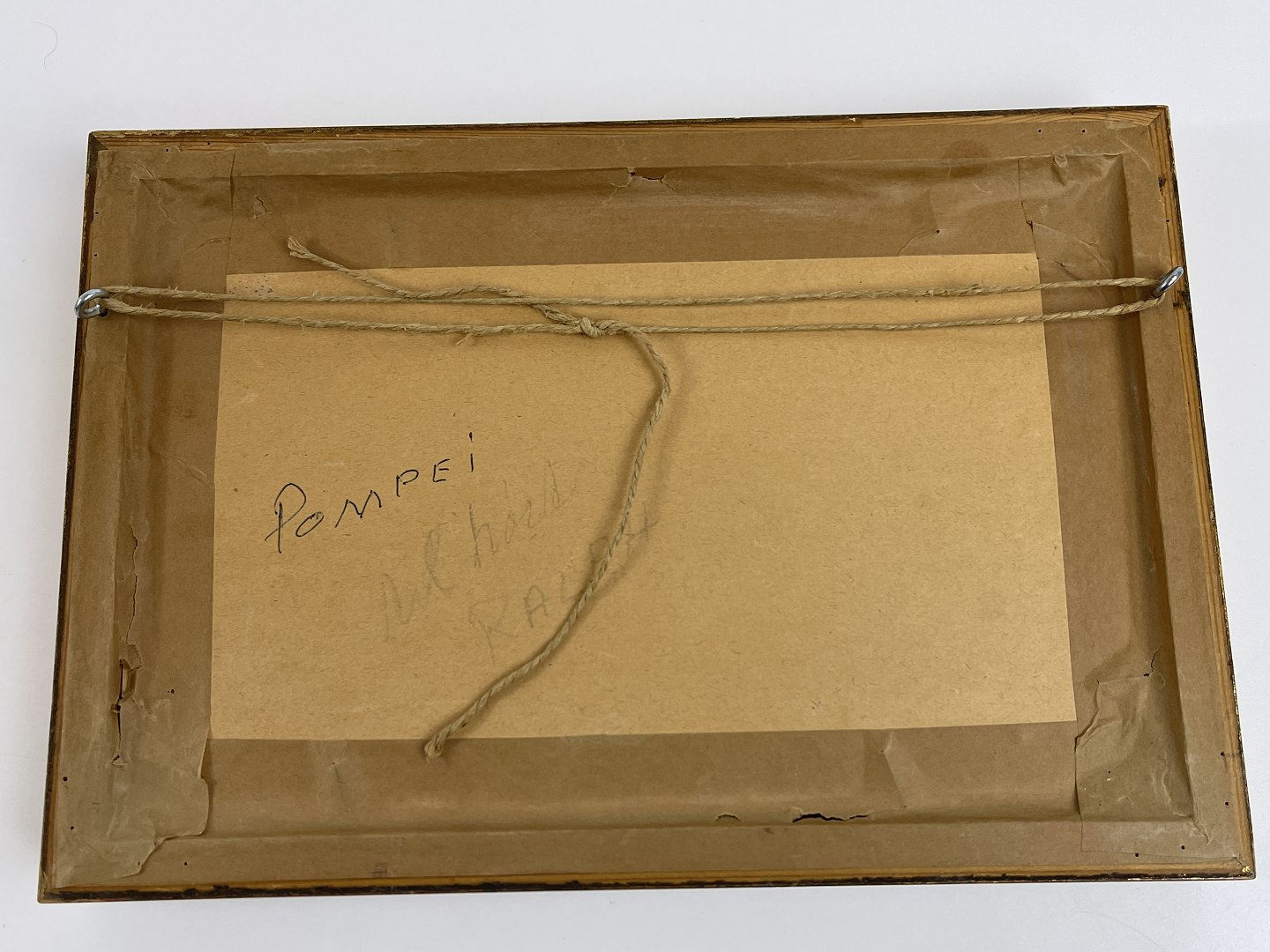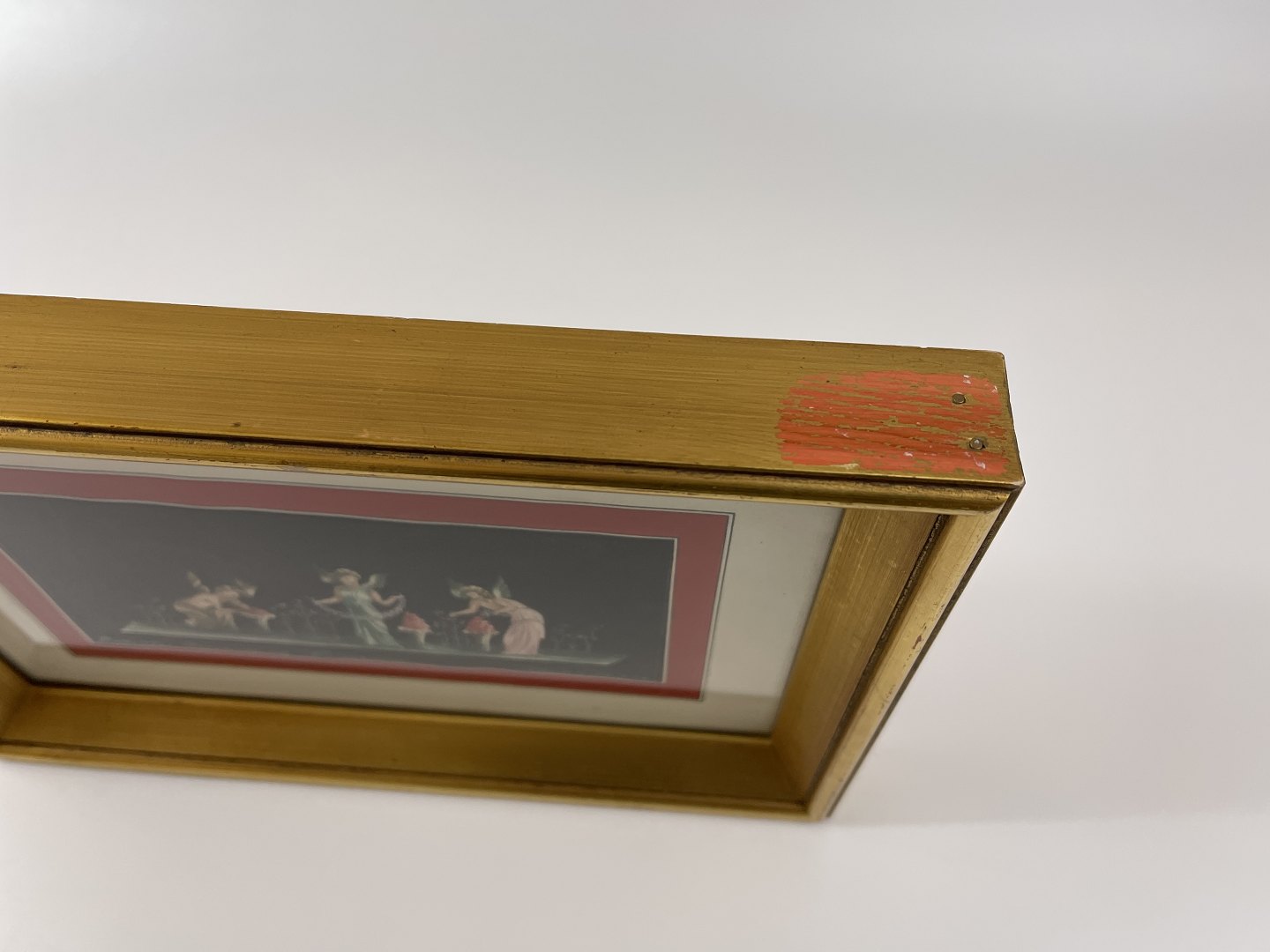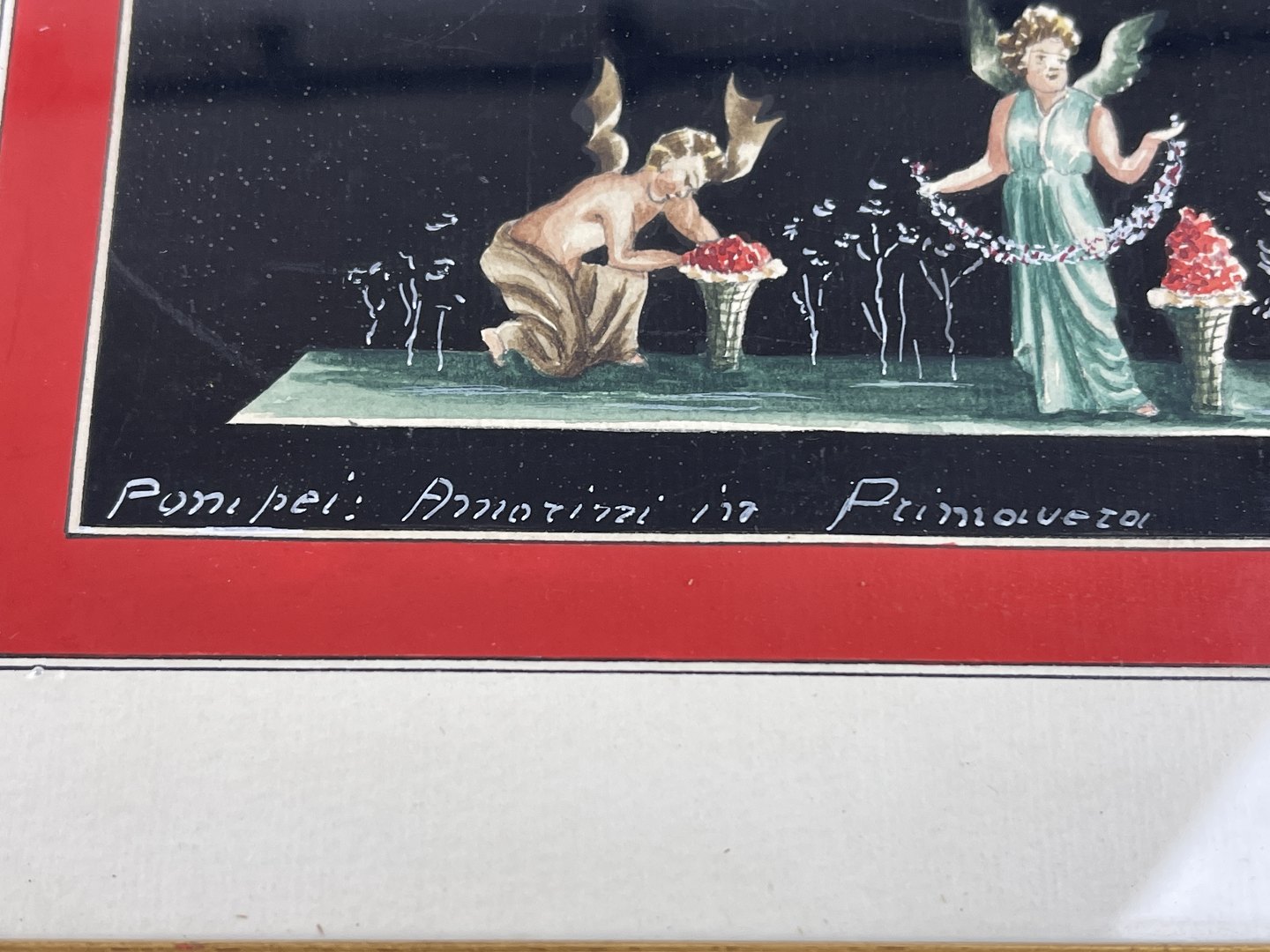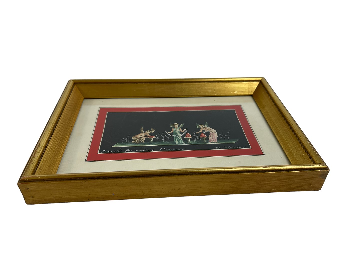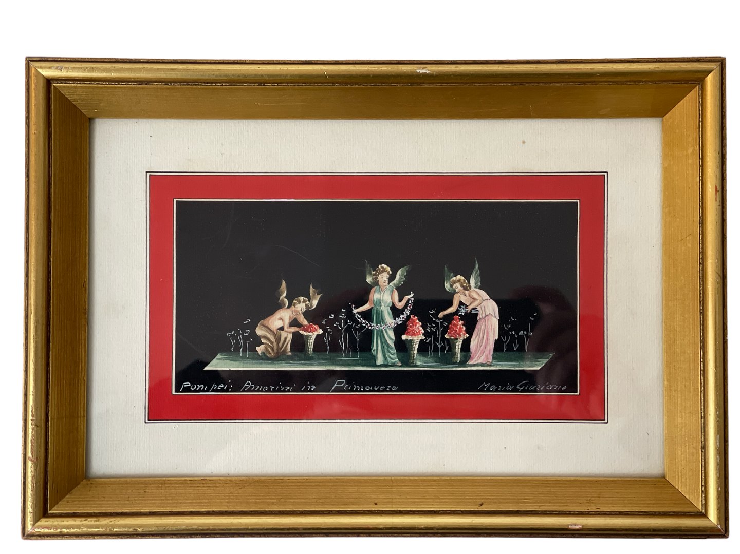 The picture is framed behind glass in a gold frame. 20th century. The image is in the style of frescoes in the House of Vettii.