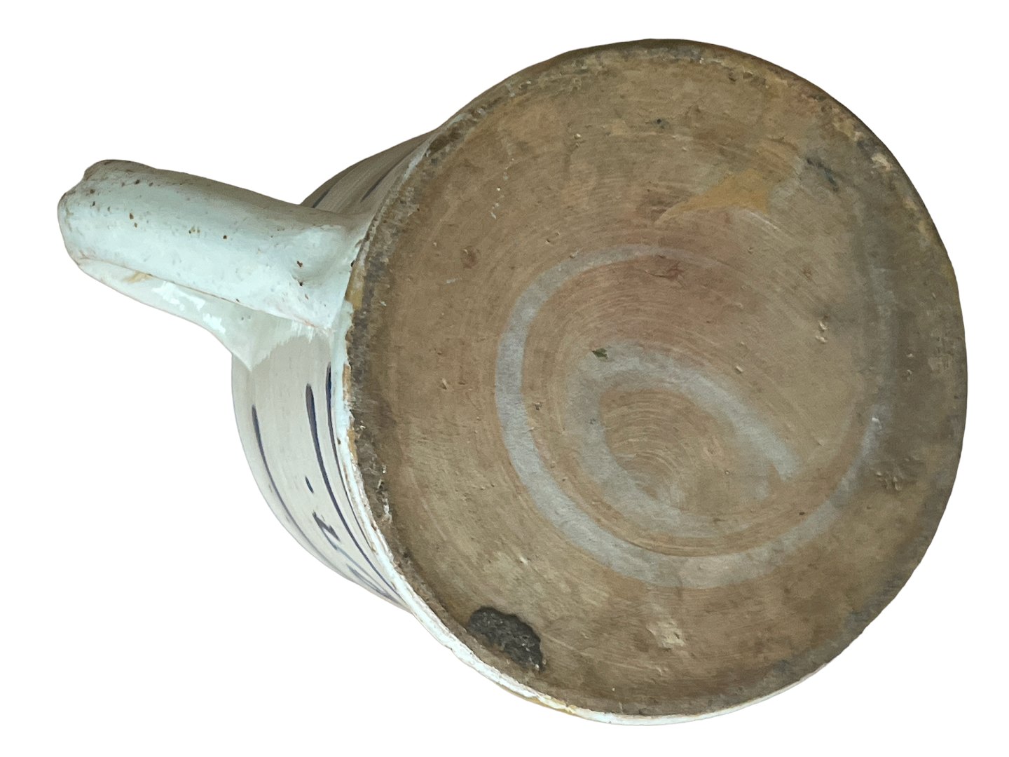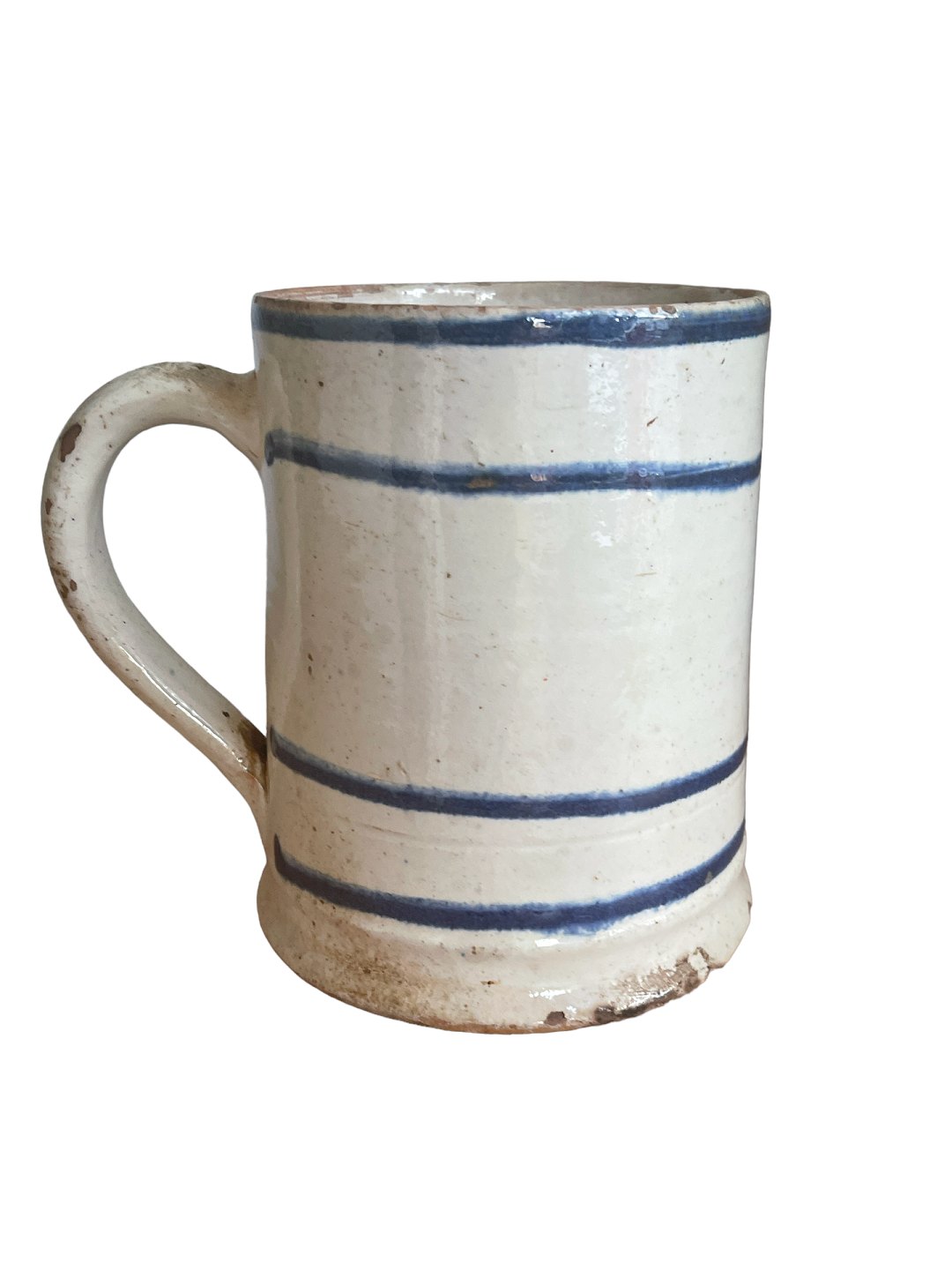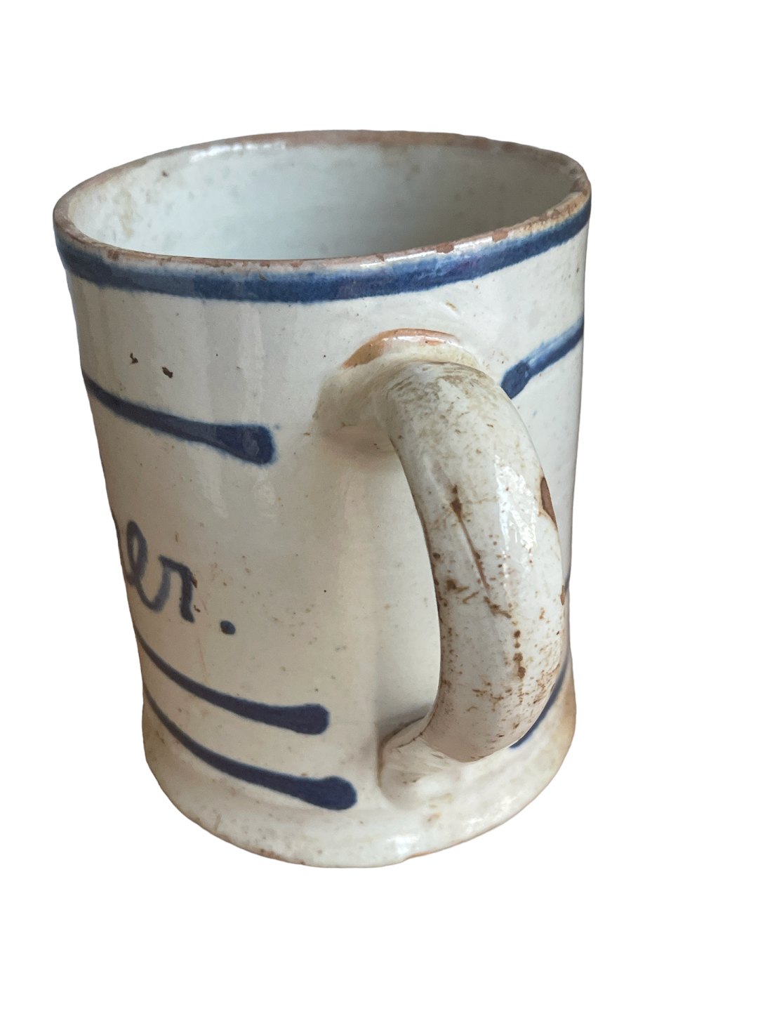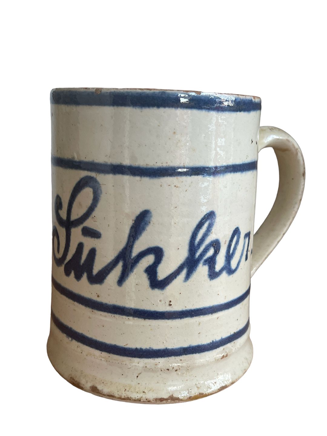 Stort, dansk almue krus af lertøj med hank - til sukker. Hvid begitning med blå bemaling under klar glasur. Kruset bærer påskriften "Sukker" og har formentligt haft et låg. Slutningen af det 19. århundrede, måske midtsjælland.
