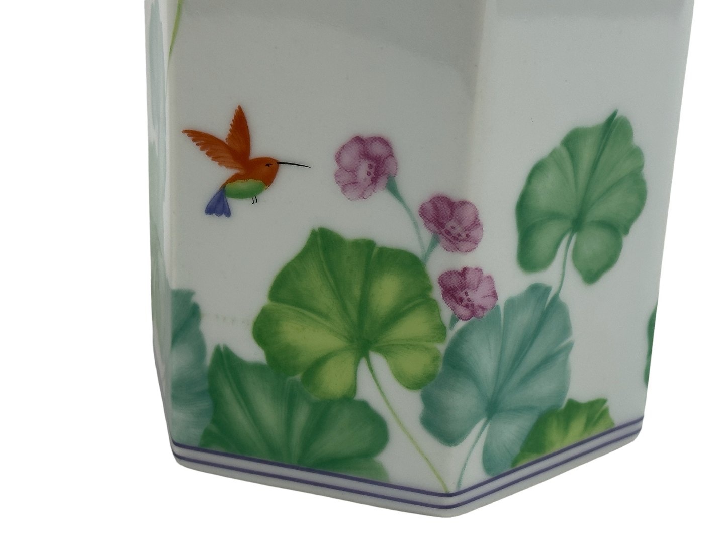 Large Colibri vase by Annegrete Halling-Koch for Royal Copenhagen. 1st sorting in very fine condition. Octagonal. Signed Annegrete Halling Koch 1810/5473. The vase is painted with flowers, leaves and birds (hummingbirds).