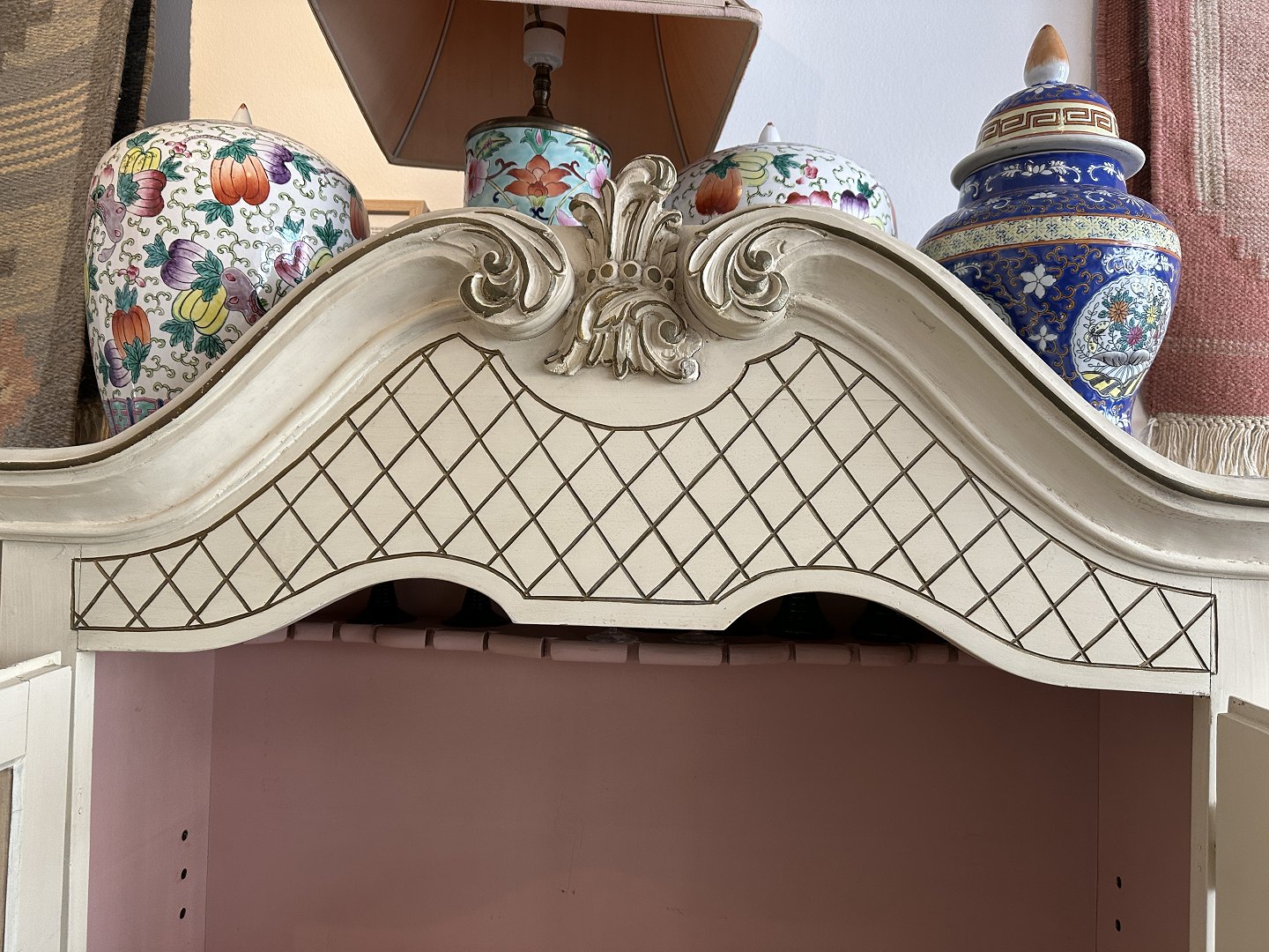 Fint hvidt og lyserødt chatol, 800 kr., rokoko-stil med rocaille i toppen. Cirka 1940-1950’erne. Brugsspor, ingen nøgle.