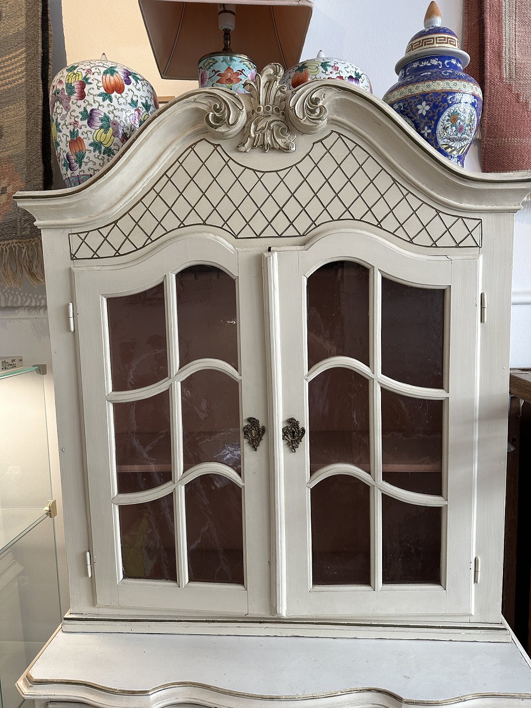 Smukt, gammelt hvidt bord med rød og hvid nistret