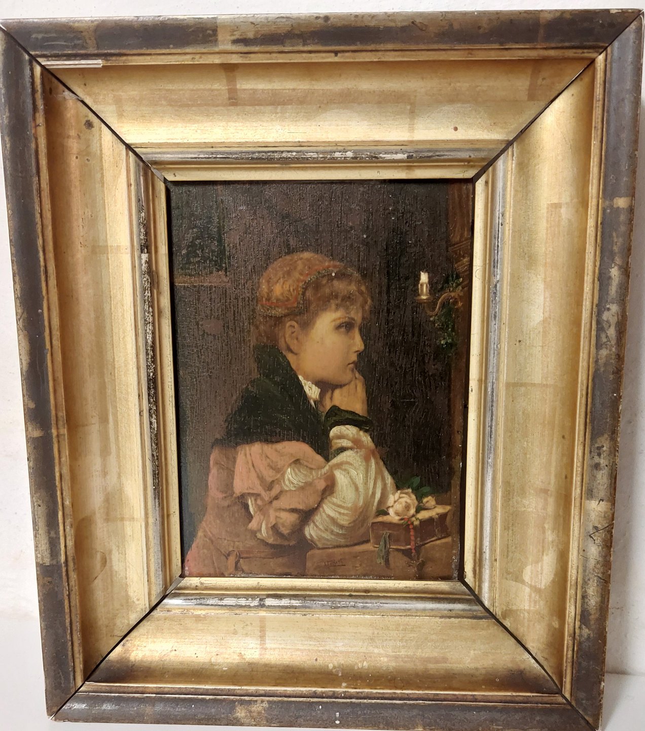 Portrait of girl 19th century in gold frame. Painted on wood. In good condition. Frame with some traces of use (see photos). Dimensions: 18.5 x 22.5 cm including the frame.