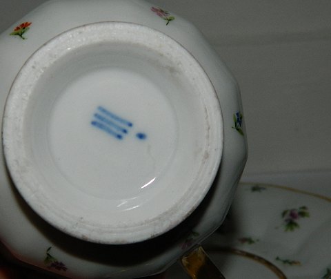 Royal Copenhagen stor morgenkop og tallerken i "Henriette". Fremstillet omkring 1850. UNDERKOPPEN ER DEFFEKT. Modellen svarer til Blå Blomst kop modelnr. 10/8501.