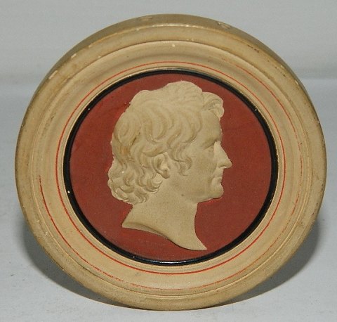Miniature platte i teracotta fra Peter Ipsen, København. Fremstillet ca. 1880-1900. Profil portræt af Bertel Thorvaldsen (1770-1844). Fabriksmærket på bagsiden. 6 cm i diameter. LIGNENDE KØBES