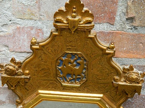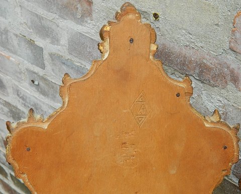 Mirror with gold frame. Frame with tricks of use. No damages or repairs. Signed on the backside. 50 cm High. Glass measures 21 cm x 16 cm