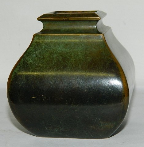 Tung Art Deco vase i bronce af Ib Just Andersen (1884-1943). Fremstår i god stand uden skader. Flot både grøn og brun bronceret overflade. Mærket med modelnummer B 158 logo DENMARK. 8½ cm høj.
