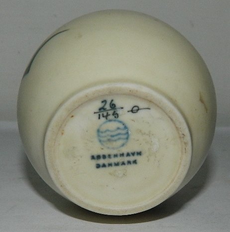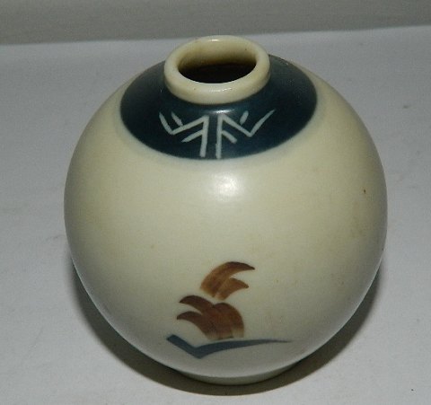 Art Deco: Round vase in iron porcelain from Aluminia. Produced between 1929-1950. Decorated with hand painted duck. In perfect condition. Factory mark from this period on the bottom. 6 ½ cm (2,50") high.