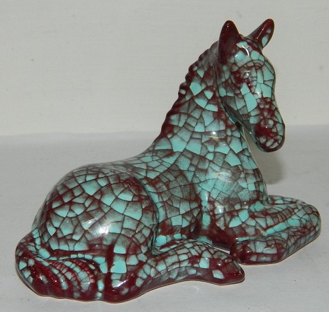 Figur i keramik af liggende hest fra MA&S, Bornholm. Dækket i persian glasur. Fabriksmærket samt fabrikslabel på undersiden. 8 cm høj og 12 cm lang