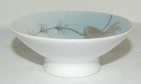 Bowl in porcelain on a foot with decoration of fish. Produced by Bing & Grondahl, Denmark, around 1920. In perfect condition. Signed by art with EB. Factory first production. 4 cm (1,50") and 9 cm (3,50") in diameter.