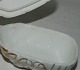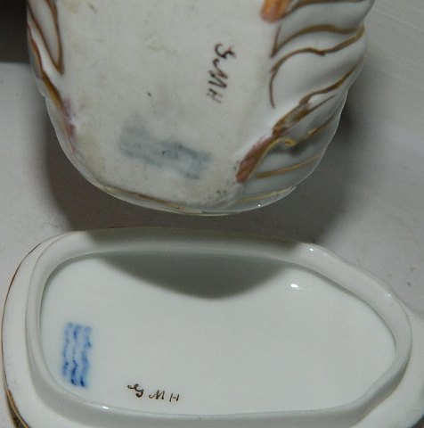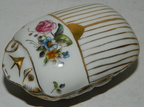 Skål i form af skarabæ fra Royal Copenhagen. Bemalet med blomster i overglasur. Fremstillet omkring 1880. Skår på indersiden af låget og skår på indersiden af skålen. Fabriksmærket på låg og under skålen. 4 cm høj og 8 cm lang.