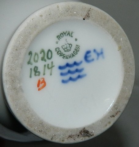 Vase i porcelæn med to ører. Dekoreret i blåt og guld med blomst og sommerfugl. Fremstillet mellem 1900-1923. Signeret af kunstneren Else Hasselriis på bunden. 19 cm høj.