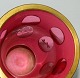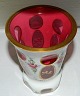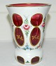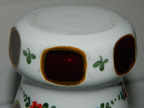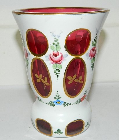 Late 19th century antique art glass from Bohemia. White overlay glass. Red inside. Handpainted flowers on the milky-white surface. Heavy tracks on use on the bottom - where it is standing on the table. Indicate use thorugh many years. No damages or repairs. 12½ cm (5") high.