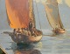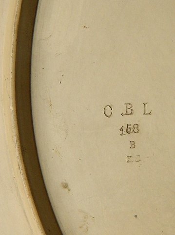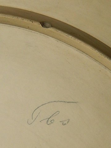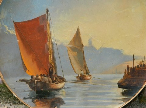 Platte in terracotta produced by L. Hjorth for the Copenhagen manufacturer Carl Budde-Lund. Cold Painted on the front with rescuers in two lifeboats. Made around 1900. Small chip on the edge. Also chipping on the rear edge. Stamped C.B.L and model number on the backside. 33 cm (13") in diameter.