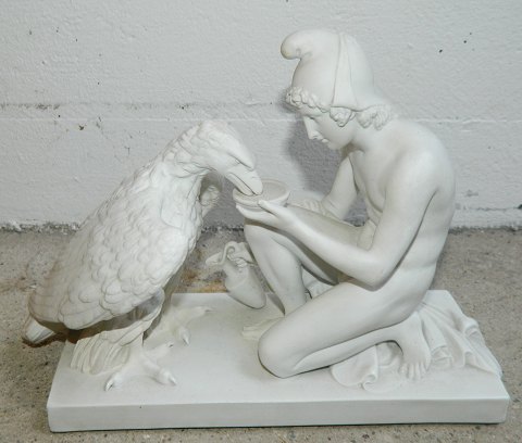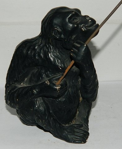 Sjælden figur i keramik af chimpanse med stang i metal. Produceret hos Aktieselskabet H. Wolffsen & Søn i Rønne på Bornholm. Modelleret af Hans Ancher Wolffsen (1870-1924). I perfekt stand. 13 cm høj - 23 cm høj incl. metalstang.