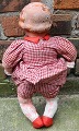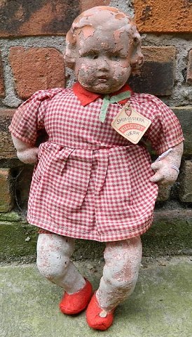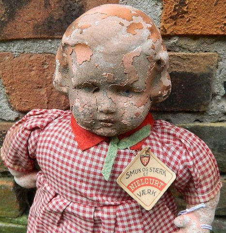 Hvordan hun er kommet til at se sådan vides ikke. Men dukkens overflade er stærkt i forfald. Har sikkert været udsat for både stært varme og kulde gennem en lang årrække. Kjolen er fin ! Vi lader billed og fabrikslabel på kjolen tale for sig selv - 32 cm høj.