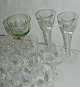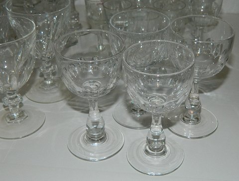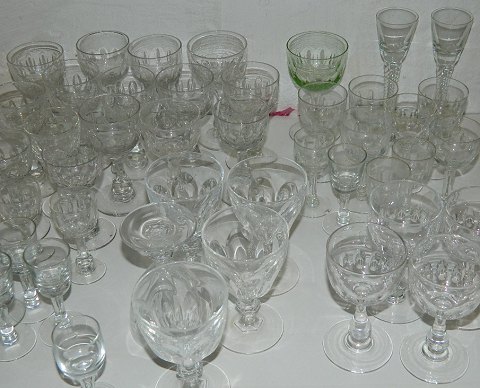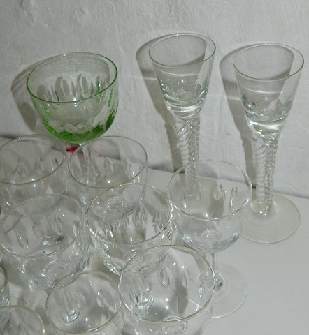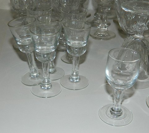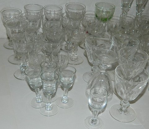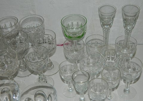 Samling gamle glas: 15 Derby fra 8½ cm til 12 cm. 5 snapseglas med tyk bund 8½ cm, 1 Don Carlos snapseglas 8 cm, 5 vinglas 10½ cm, 4 hedvinsglas med dråbeformet stilk, 7 Murat fra 7½ cm til 11½ cm (grønt glas) samt 2 høje snapseglas på snoet stilk på 14 cm.