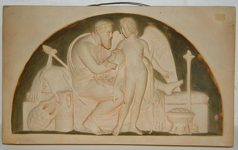 After Bertel Thorvaldsen motif from Rome 1823: Peter Ipsen, Copenhagen, plate / relief in terracotta from the late 19th century. The relief shows Cupid and Anacreon ("Winter"). In good condition with no chips, cracks or damage. Factory marks on the back. Dimensions: 17 ½ cm x 29 cm (6,75" x 11,50")
