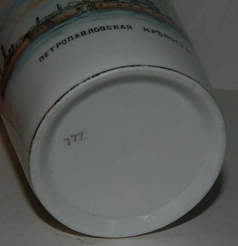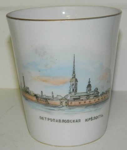 Russisk bæger i porcelæn. Fremstillet til ære for St. Petersborg 200-års byjubilæum 1703-1903. Bægeret er dekoreret med portræt af Zar Peter den Store samt prospekt af Peter og Paul Katedralen. Nummereret på bunden. 10½ cm høj