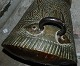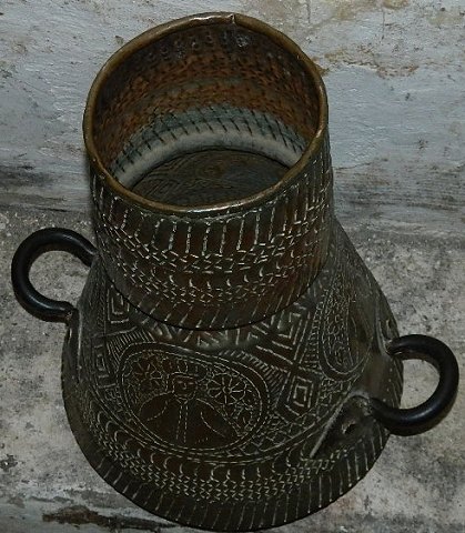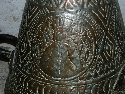 Large water container in copper with two handles. Middle East 19th century. Decorated with turban-clad man. In good condition. Is not waterproof. Small tear at the bottom edge can be repaired. 49 ½ cm high, the bottom diameter is 36 cm and the opening diameter is 17½ cm.