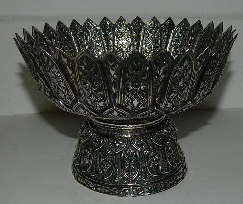 Skål i sølv på fod. Fremstillet i Persien i 19. århundrede. Fremstår i perfekt stand. Hverkan sølvstemplet eller fabriksmærket. Metallet er dog tested, hvorfor der medfølger garanti for at metallet er sølv. Ca. 110 gram. Ingen skader eller reparationer. 10½ cm høj. Åbningsdiameter 14½ cm. Bundens diameter er 8½ cm.