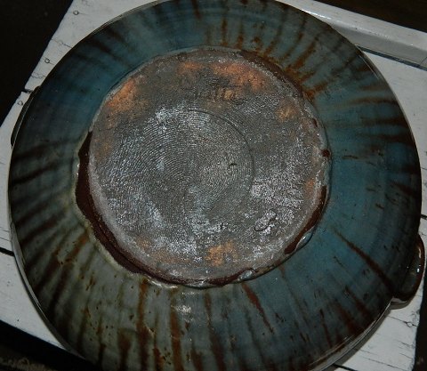 Stor skål med par hanke i keramik af Gutte Eriksen (1918-2008). Ribbet bemalet dekoration. Glaseret indenvendigt -og udenvendigt. Fremstår i perfekt stand. Signeret med Gutte på bunden. 19½ cm høj. Åbningsdiameter 29½ cm.