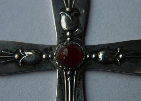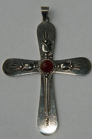Vedhæng i form af kors i sølv 830S. Dekoreret med blomster samt rød sten. I perfekt stand. Sølvstemplet på bagsiden sammen med ubekendt mesterstempel. 6 cm langt.