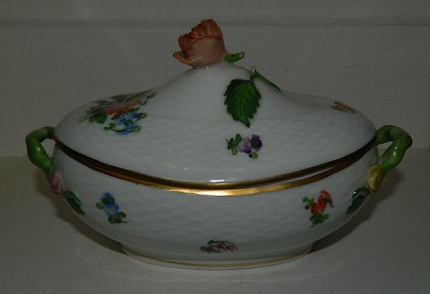 Small bowl or lidded bowl from Herend factory in Hungary. The flower on the lid is missing its stem. Otherwise in good condition. Factory mark on the bottom. 18½ cm long.