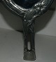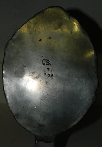 Håndspejl i tin udført af Mogens Ballin (1871-1914). Skønvirkedekoration. Har været knækket ved overgangen mellem spejl og håndtag. Gammel reparation. Fabriksmærket på bagsiden.