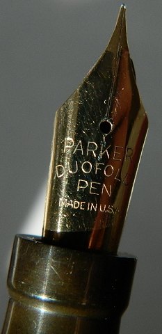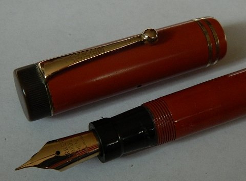 Stor koral rød Parker Duofold fyldepen fra omkring 1930. Push button fylder. Ny gummisæk skal indsættes før brug. Fyldepennens blindhætte har et mindre afslag. Den sorte sektion spidsen (nib´en) sidder på har en dyb ridse. Ellers ingen skader eller reparationer. Alle dele original til denne model. 13½ cm lang. (LIGNENDE GAMLE FYLDEPENNE KØBES)