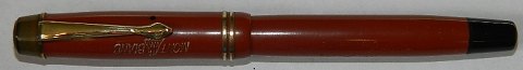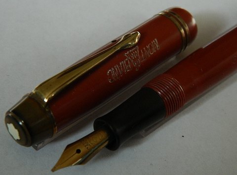 SIMPLO ORIGINAL MONT BLANC: coral red Montblanc no. 2 fountain pen from around 1940. Push button filler. In good condition with no damage or repairs. New rubber bag must be inserted before use. Personal name engraved: GUDRUN LARSEN. No damages or repairs. 12½ cm long.