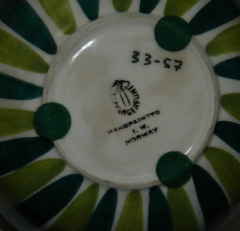 Colorful bowl in faiance from Stavangerflint in Norway designed by Inger Waage. In perfect condition. Factory marks and artist initials I.W. on the bottom. 9½ -10 cm high and 16 cm in diameter.