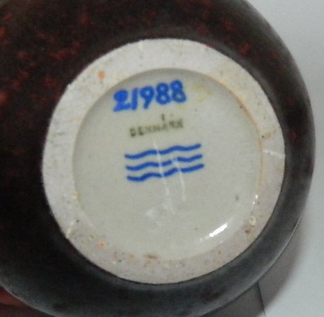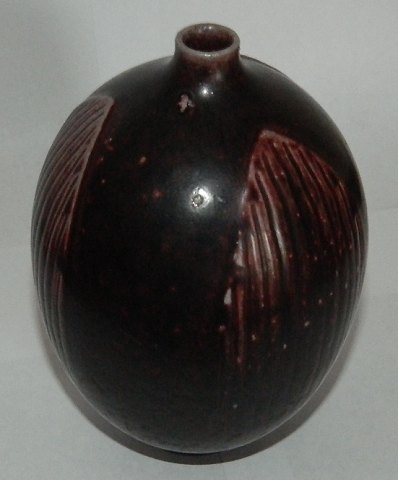 Vase i stentøj fra Royal Copenhagen. Dekoreret med blade. Dækket af rød okseblodsglasur. Designet af Gerd Bøgelund (1890-1959). Fremstår i god stand uden skader eller reparationer. 3. sortering. Signeret gb under de tre blå bølger. 16½ cm høj